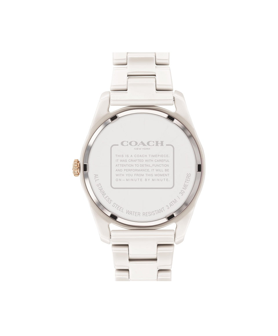 The Preston watch is an elegant pick for everyday. Crafted of white lightweight and scratch-resistant ceramic, it has a sleek lacquer dial finished with crystal markers and the Coach Signature.
