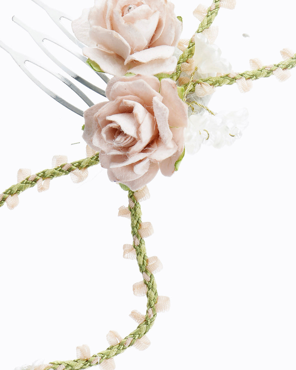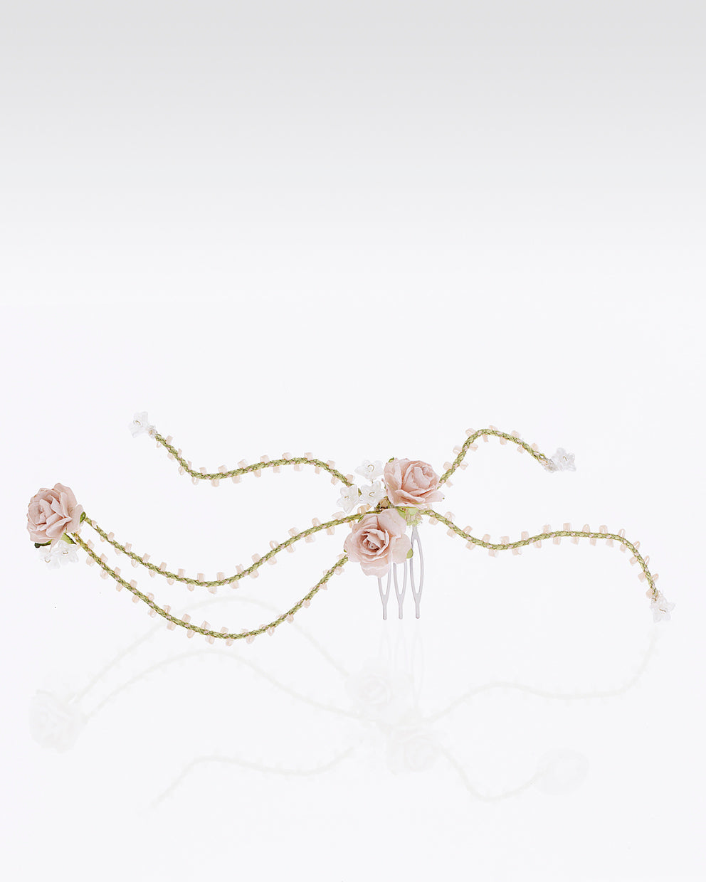 Bridal mantilla comb with flowers and beadwork detail. Available in natural, nude, blue and pink.