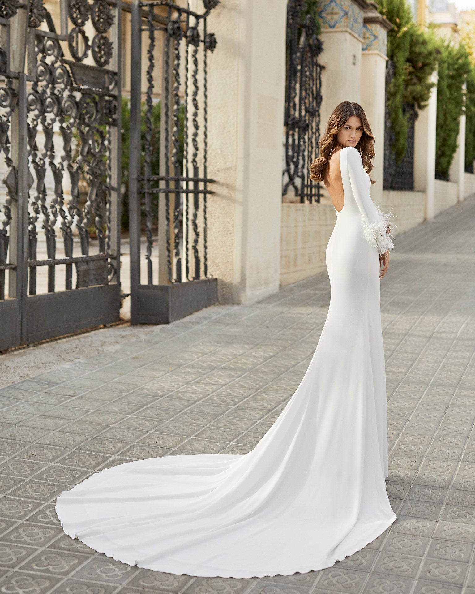 Sheath-style wedding dress in stretch crepe with feathers on cuffs, bateau neckline, long sleeves and low back.