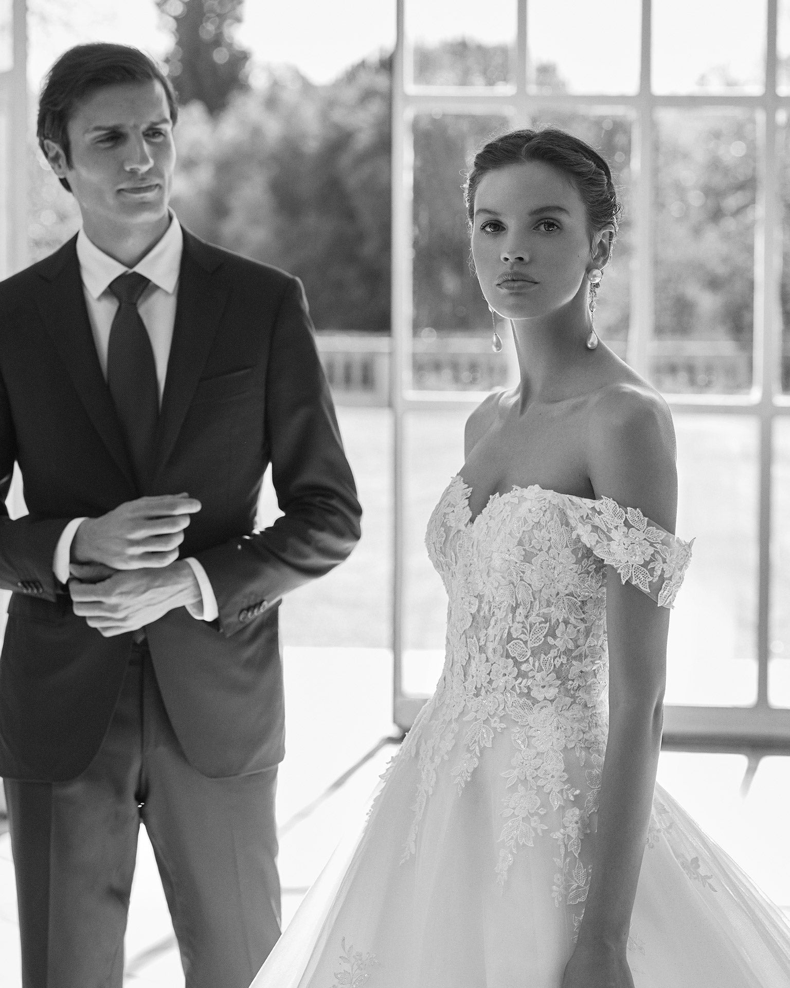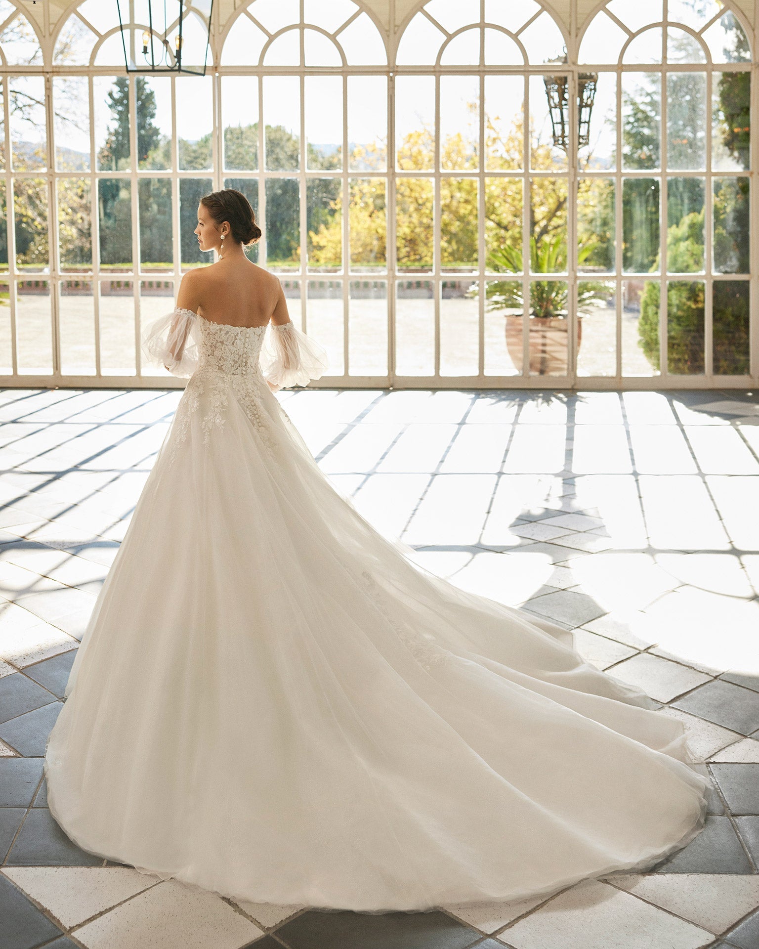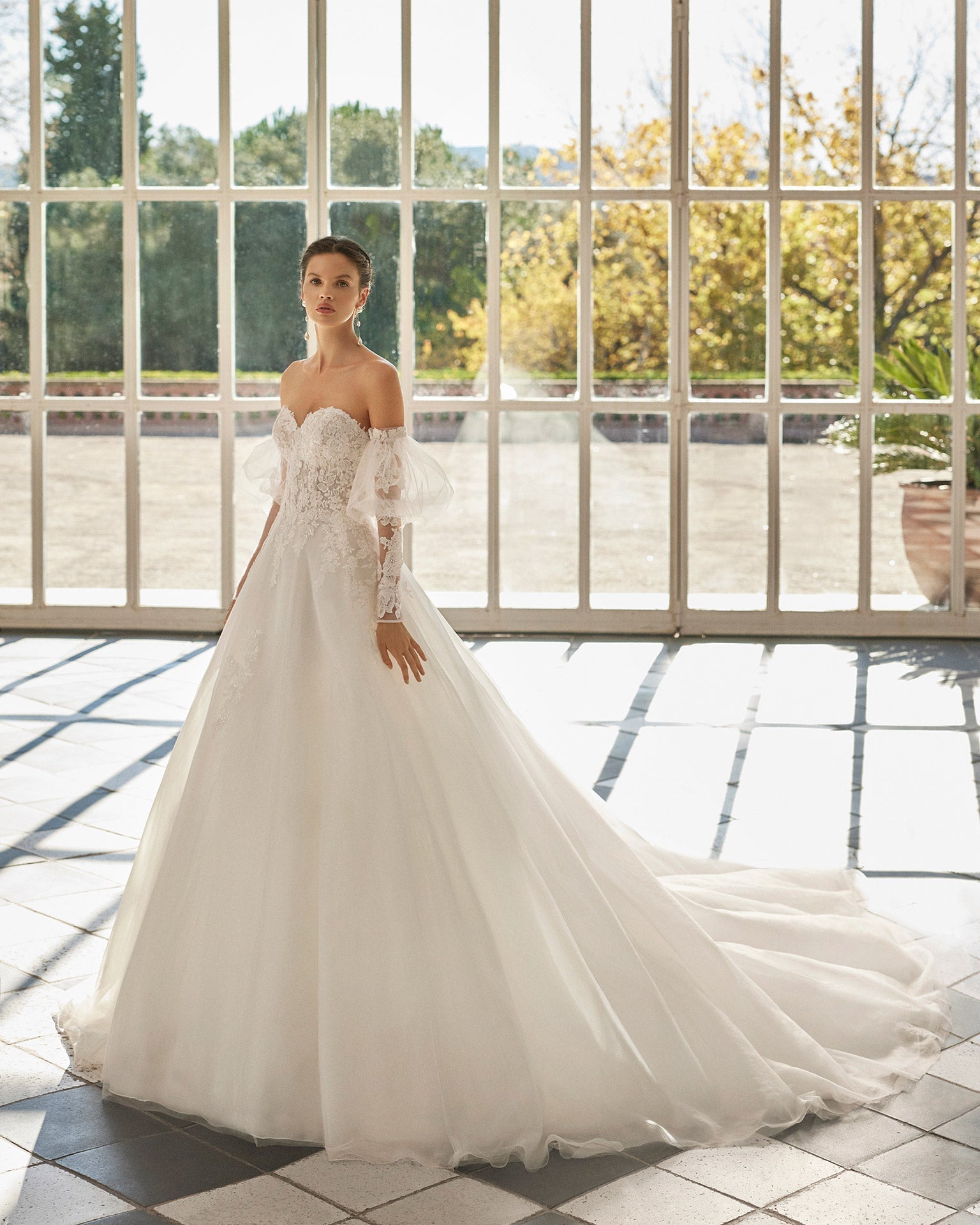 Baroque princess-style wedding dress, made of tulle with beadwork appliqués. Aire Barcelona look with a strapless push-up corset structure, detachable tulle and lace sleeves, and a glitter skirt.