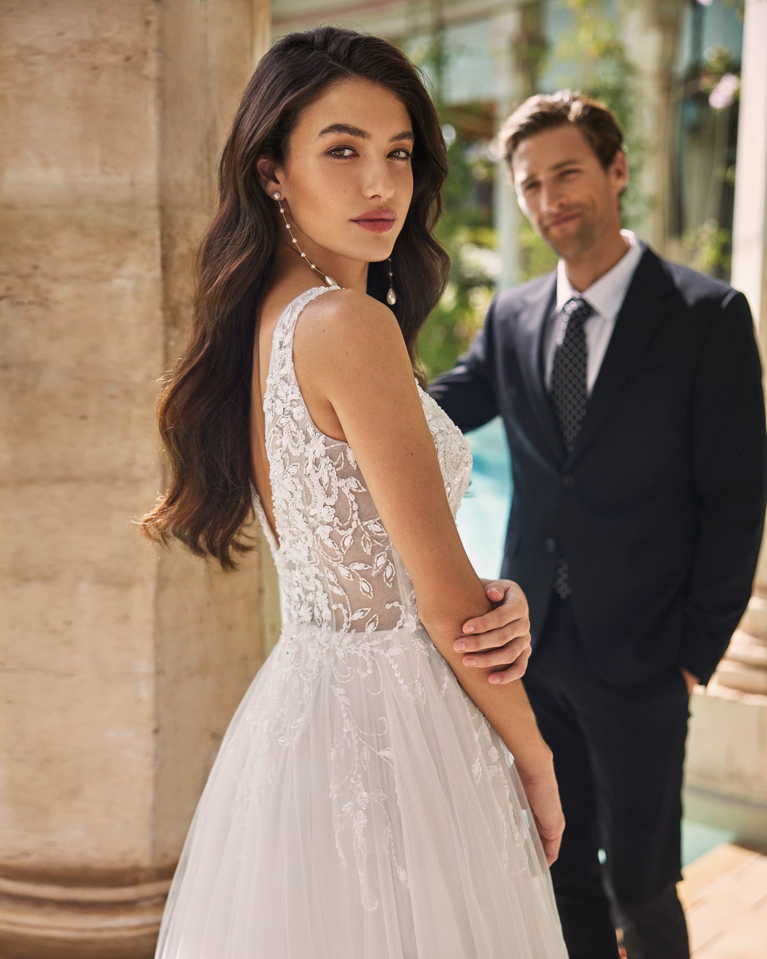 Princess-style A-line wedding dress, crafted in tulle and beadwork. This exclusive Adriana Alier outfit features a V-neckline and open back. Extra beadwork.