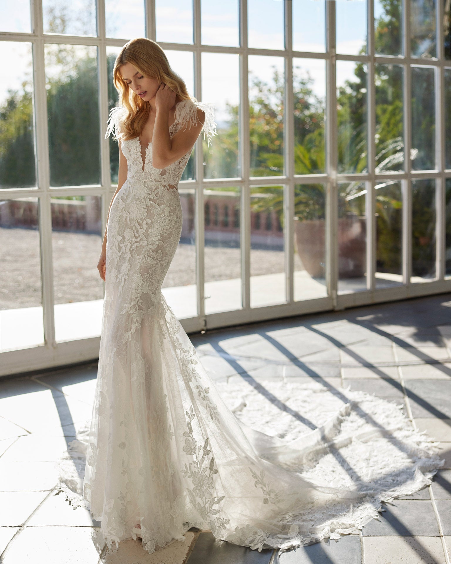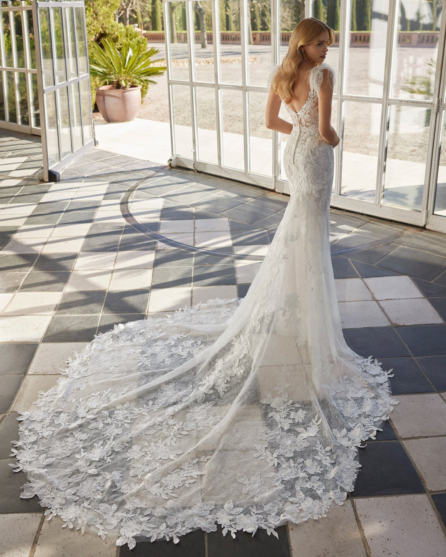 Romantic long mermaid-style wedding dress made in lace. A V-neckline, open back and feathered straps complete the look. A dreamy Aire Barcelona design.