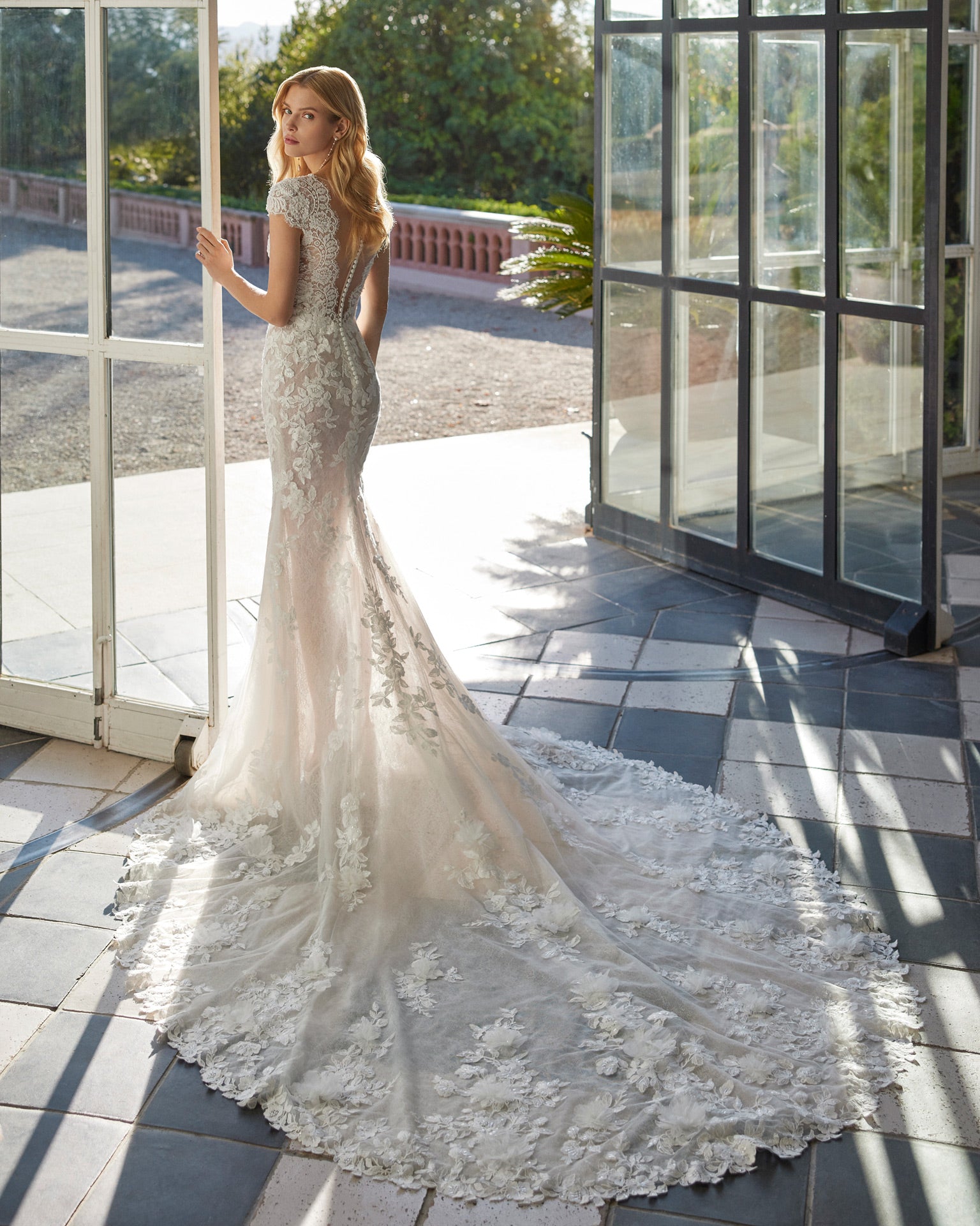 Fantasy style long mermaid-style wedding dress crafted in lace with beadwork details. Featuring a V-neckline, buttoned back and short sleeve. A dreamy Aire Barcelona design.