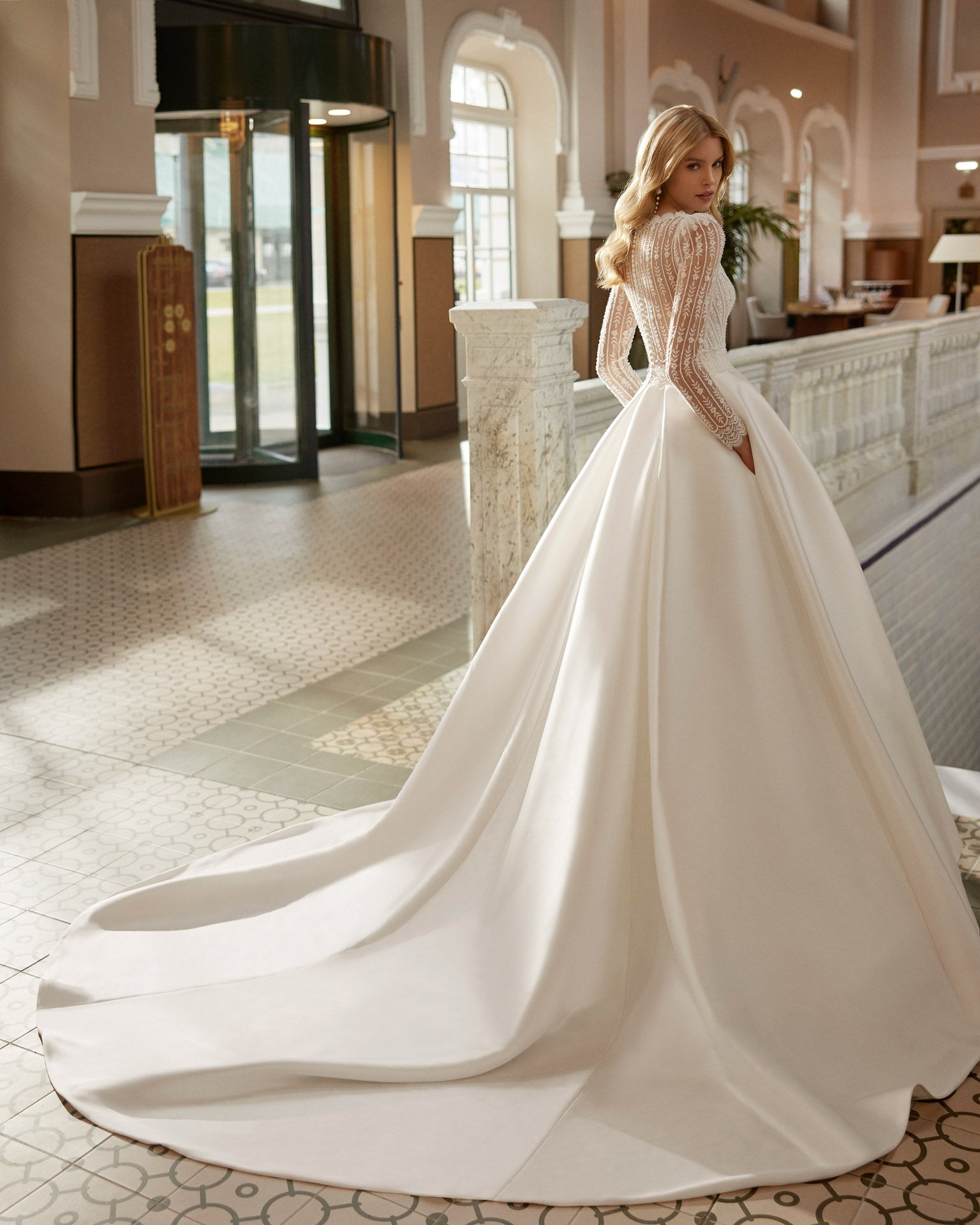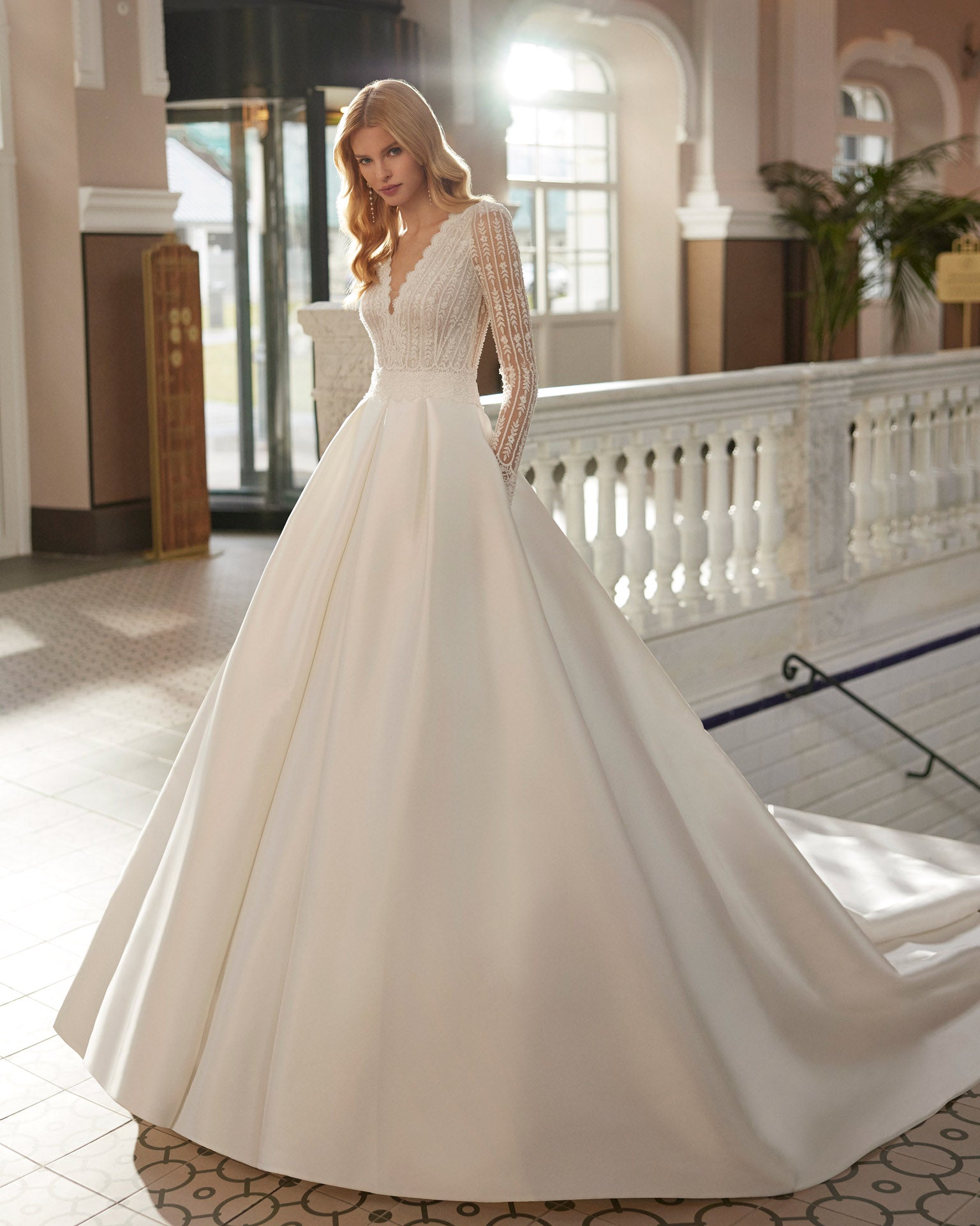 Romantic long princess style wedding dress, crafted in lace, beadwork and Sienna. With V-neckline, closed back and long sleeve. A dreamy Aire Barcelona design.