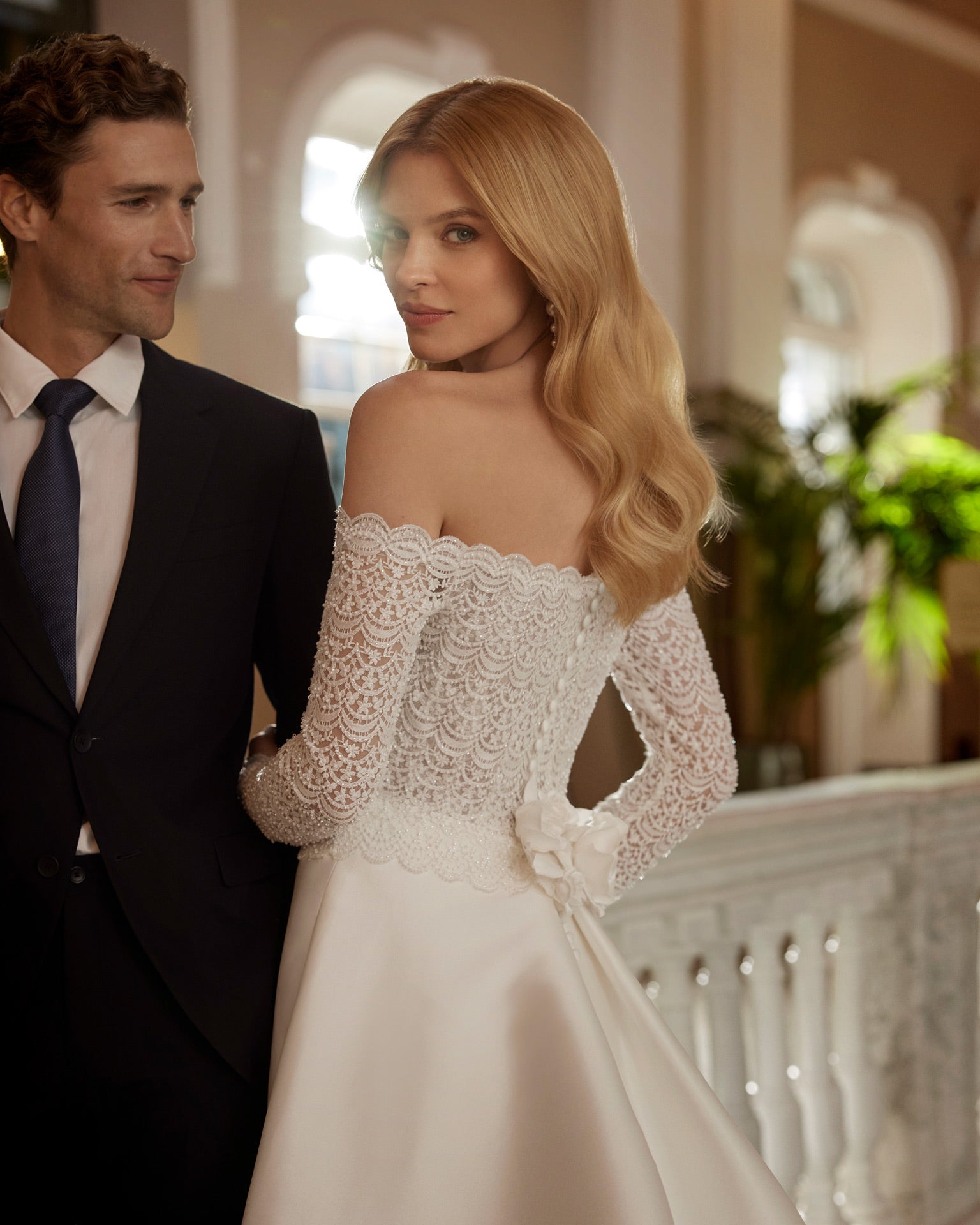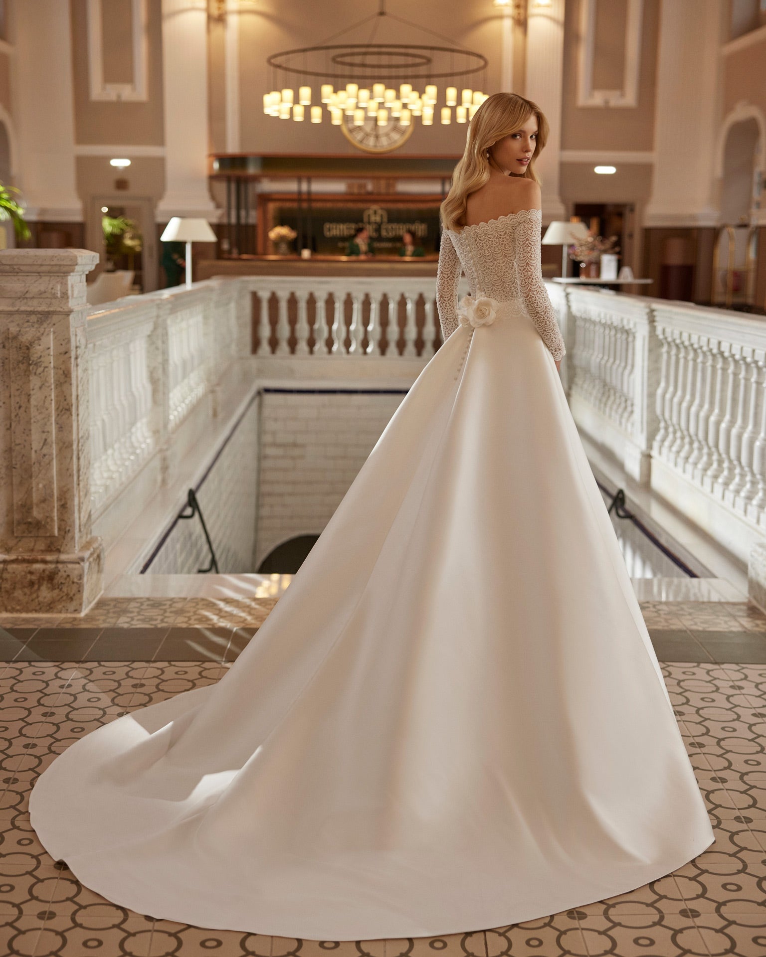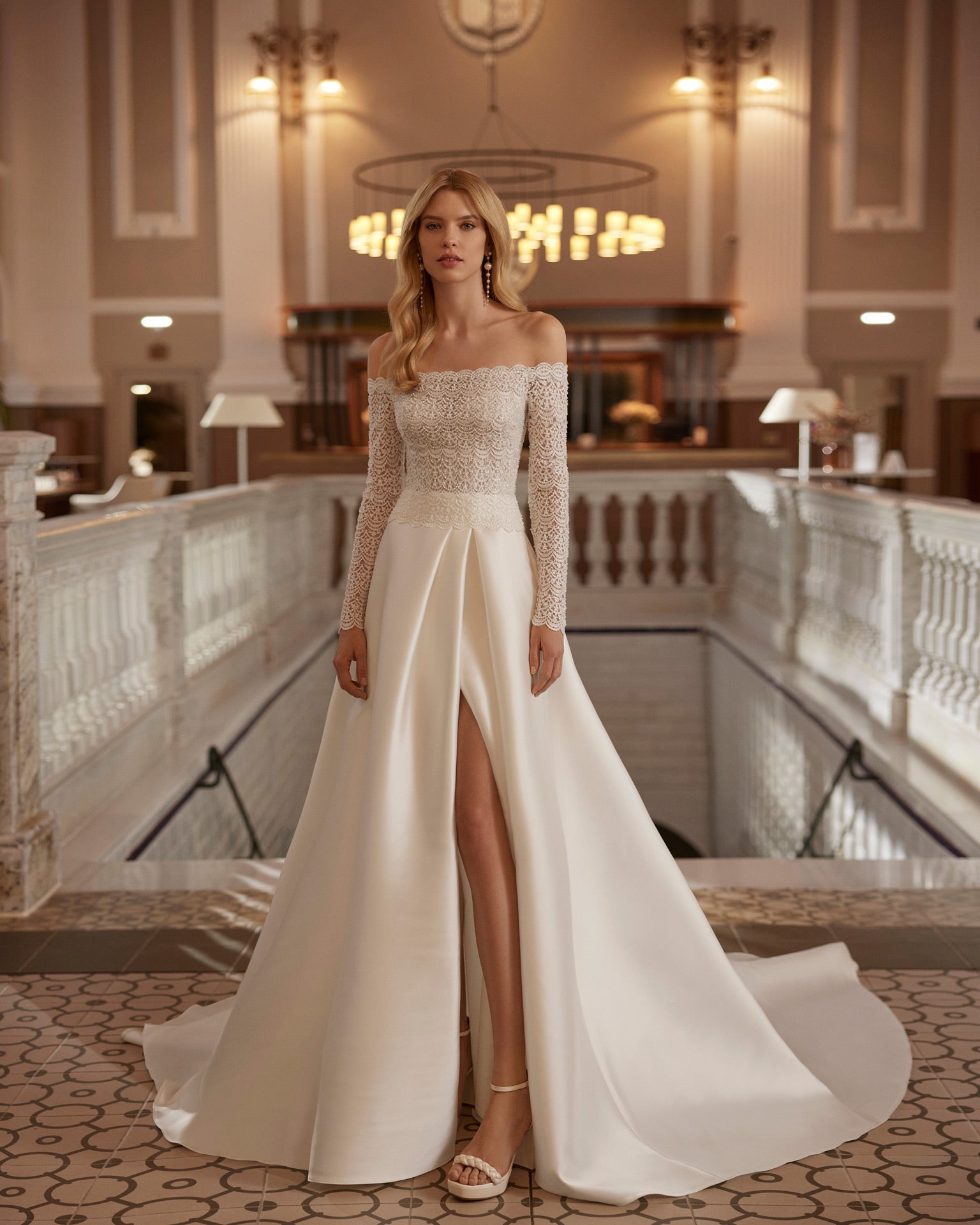 Romantic long A-line wedding dress crafted in mikado, lace and beadwork. Featuring an off-shoulder neckline, long sleeves, a skirt with a front slit and a flower embellishment. An exclusive Aire Barcelona design.