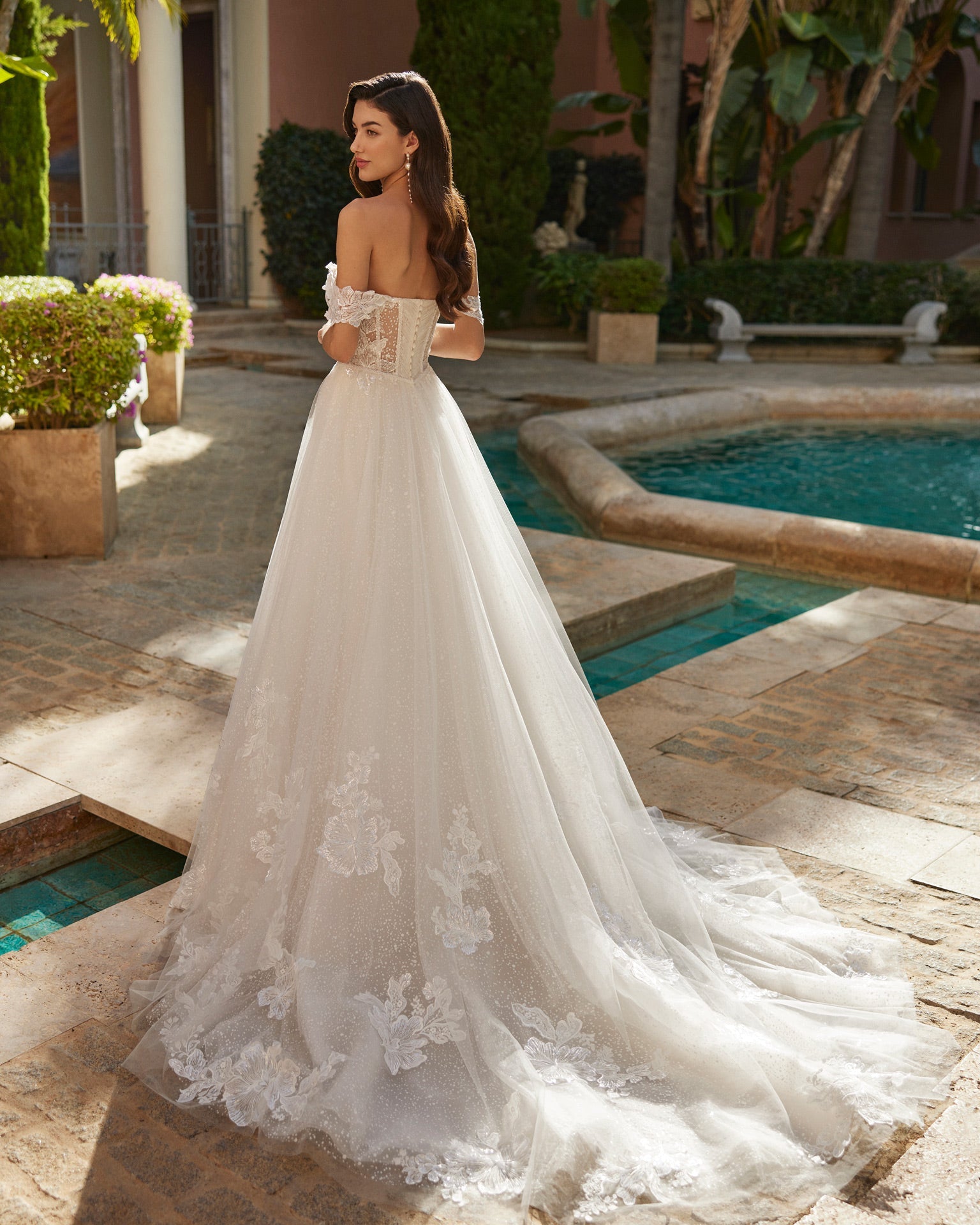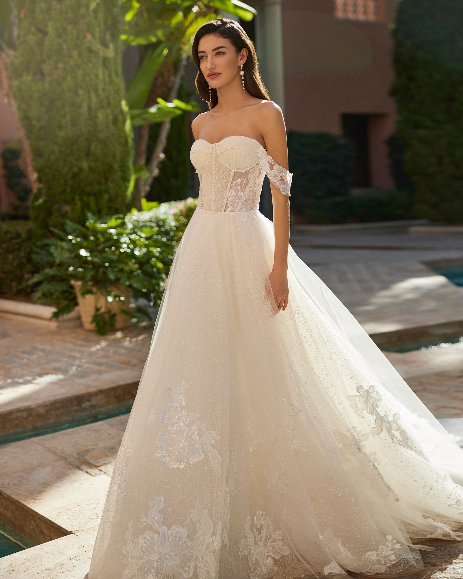 Long A-line princess wedding dress, crafted in lace with a snow tulle skirt. The sweetheart neckline, buttoned back and off-shoulder straps complete the look.