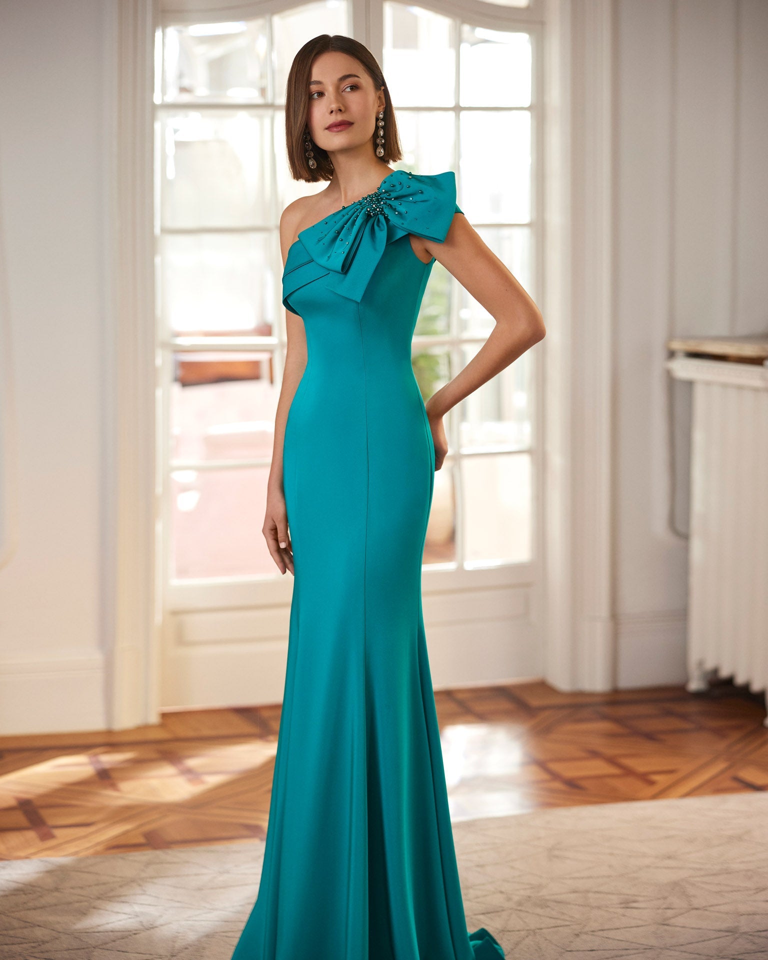 Elegant long cocktail dress crafted in satin crêpe with beadwork detailing. Featuring an asymmetric neckline and a shawl. A Marfil Barcelona design.