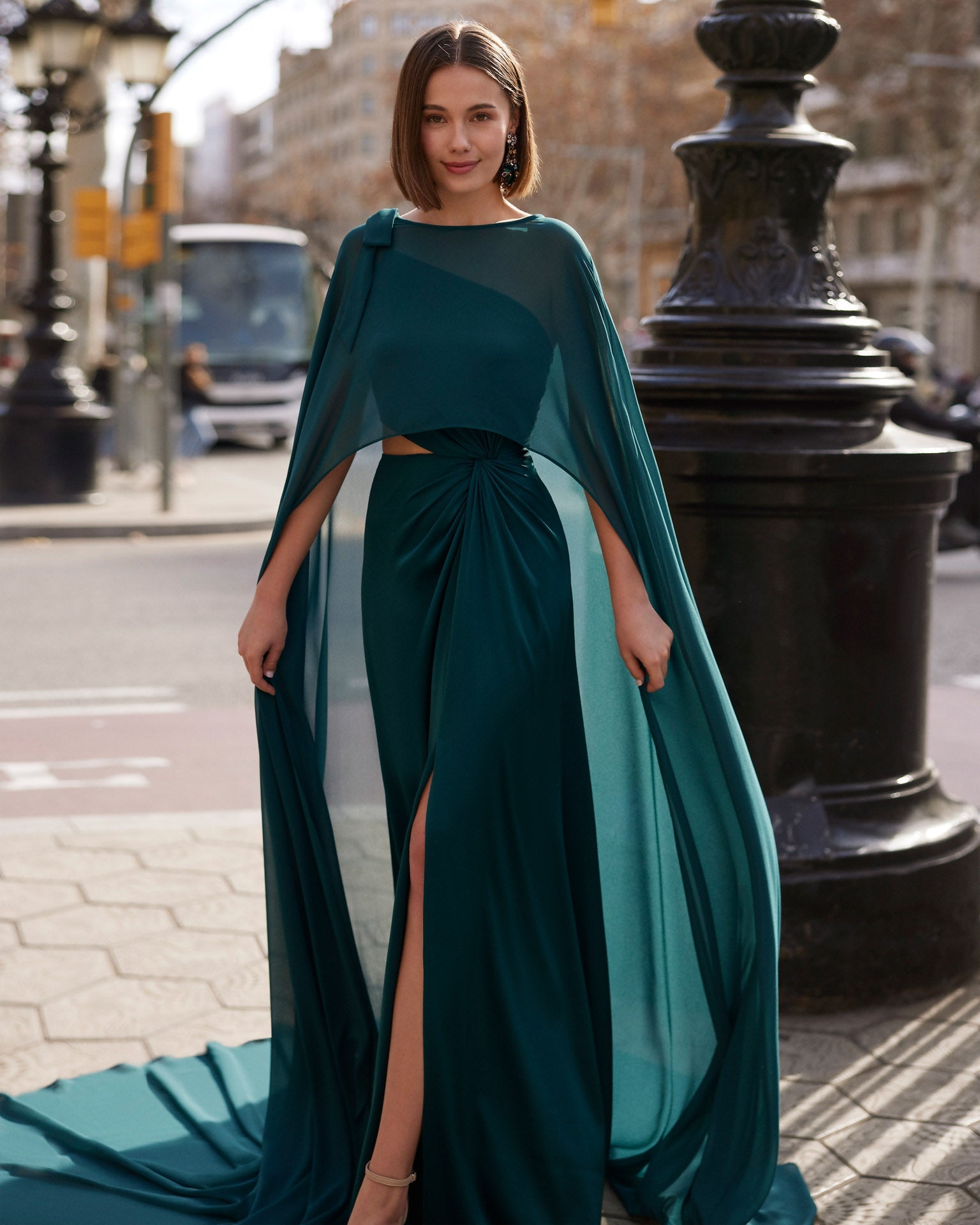 Two-piece long evening dress version (without cut-out embellishment), cape. Marfil Barcelona look.