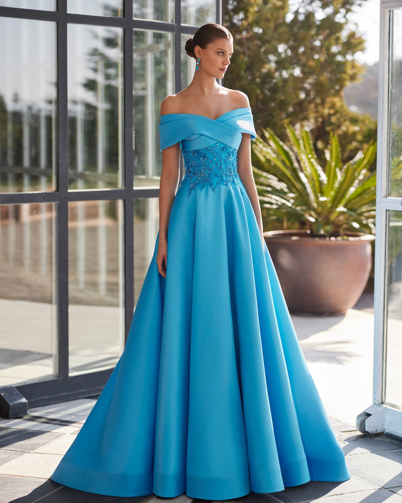 Long evening dress crafted in mikado combined with beadwork. Off-shoulder neckline, keyhole back and sleeveless bodice. A Marfil Barcelona look.