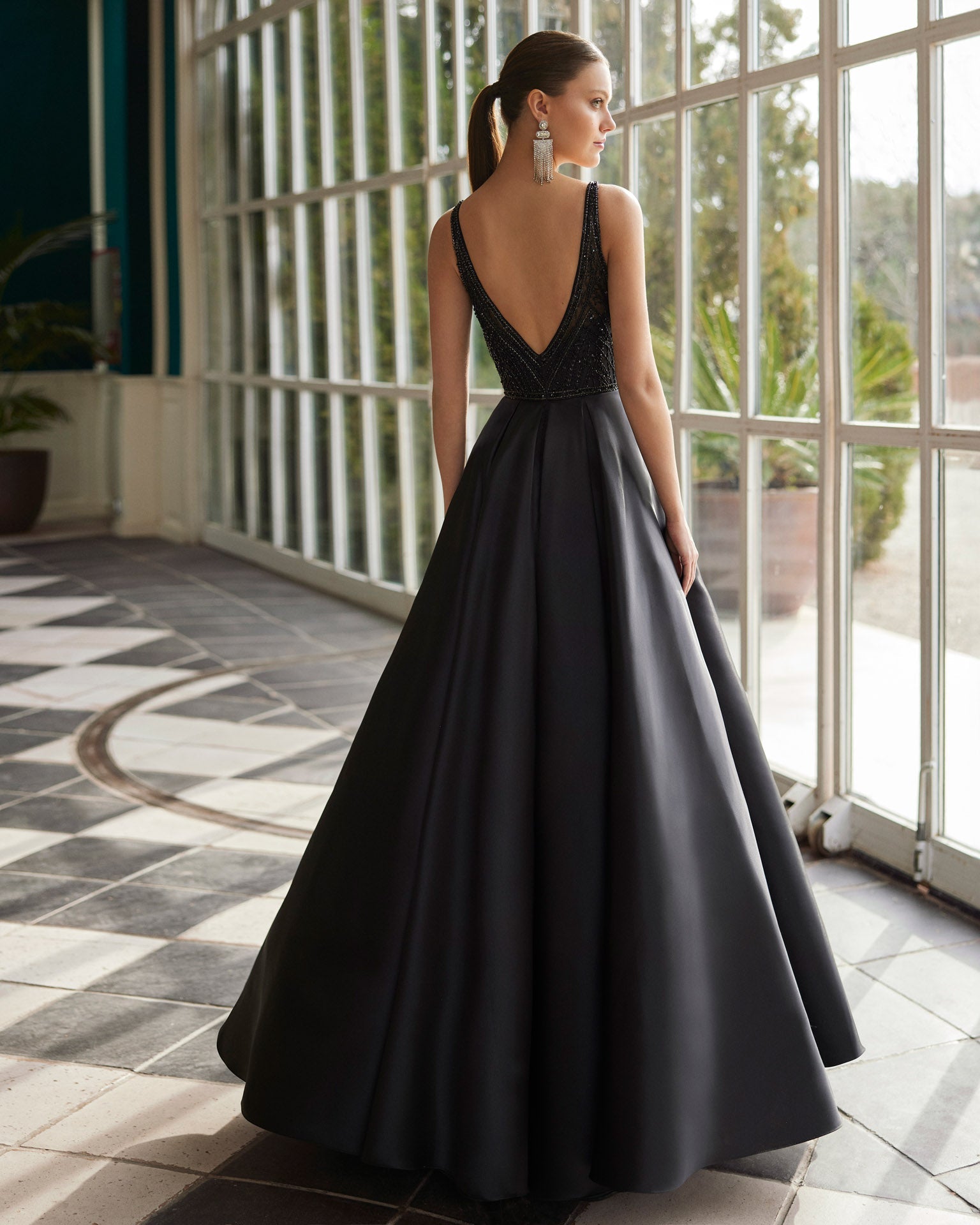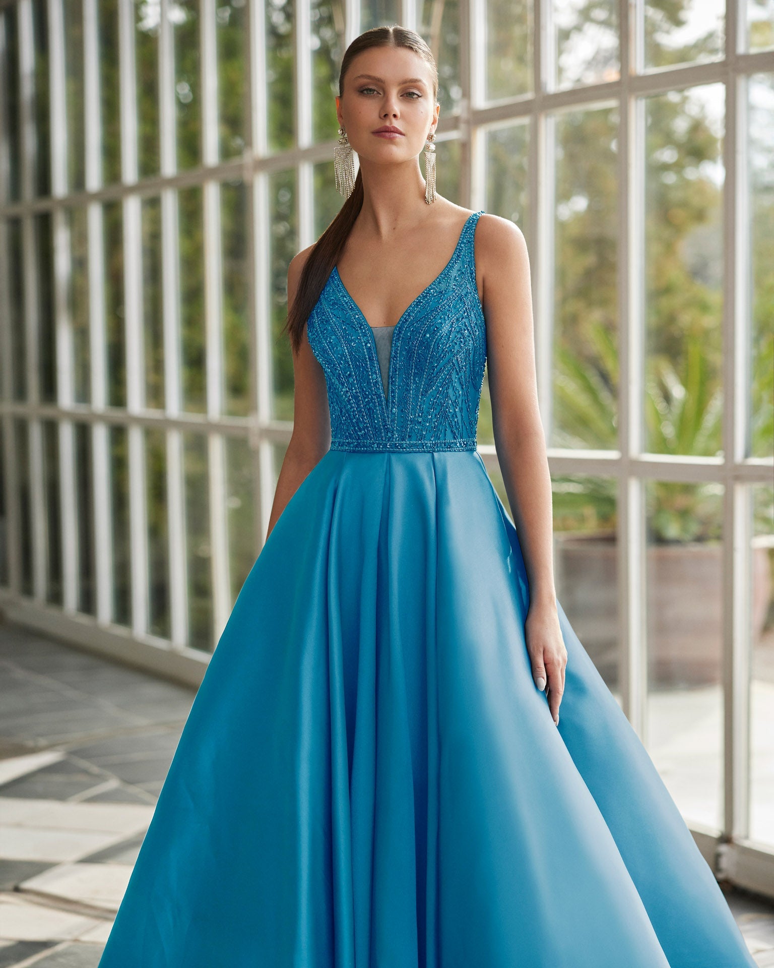 Long evening dress crafted in mikado combined with beadwork. Featuring a V-neckline and V-back, straps, and a skirt with pockets. A Marfil Barcelona look.