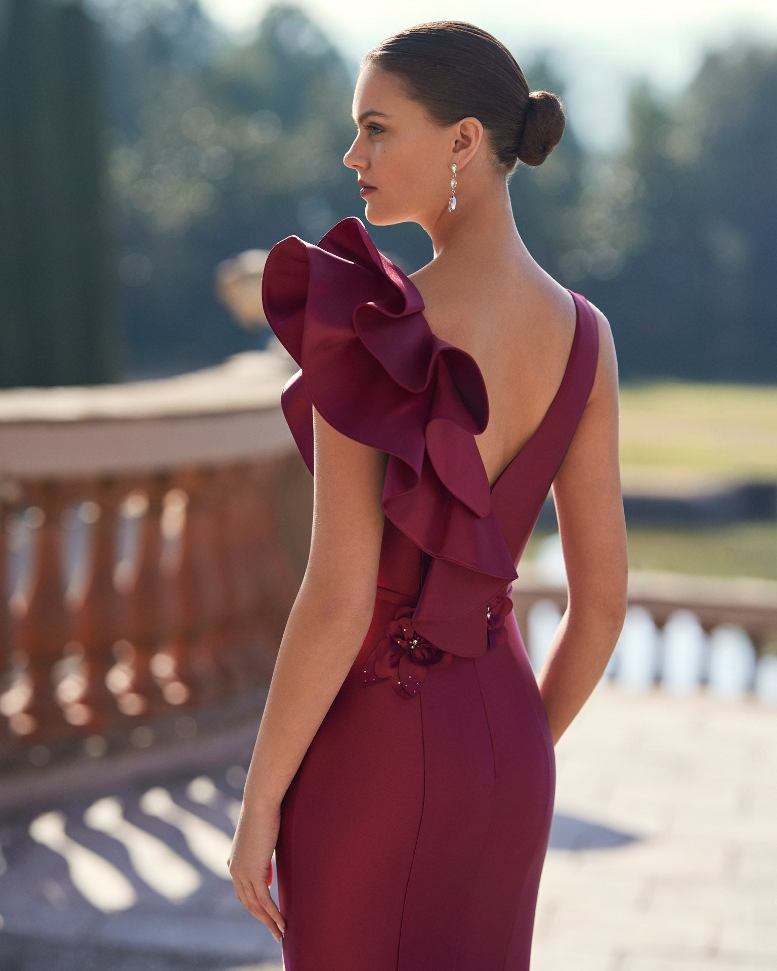 Long evening dress crafted in mikado. Featuring a V-neckline and V-back, flounced straps and a flower embellishment. A Marfil Barcelona look.