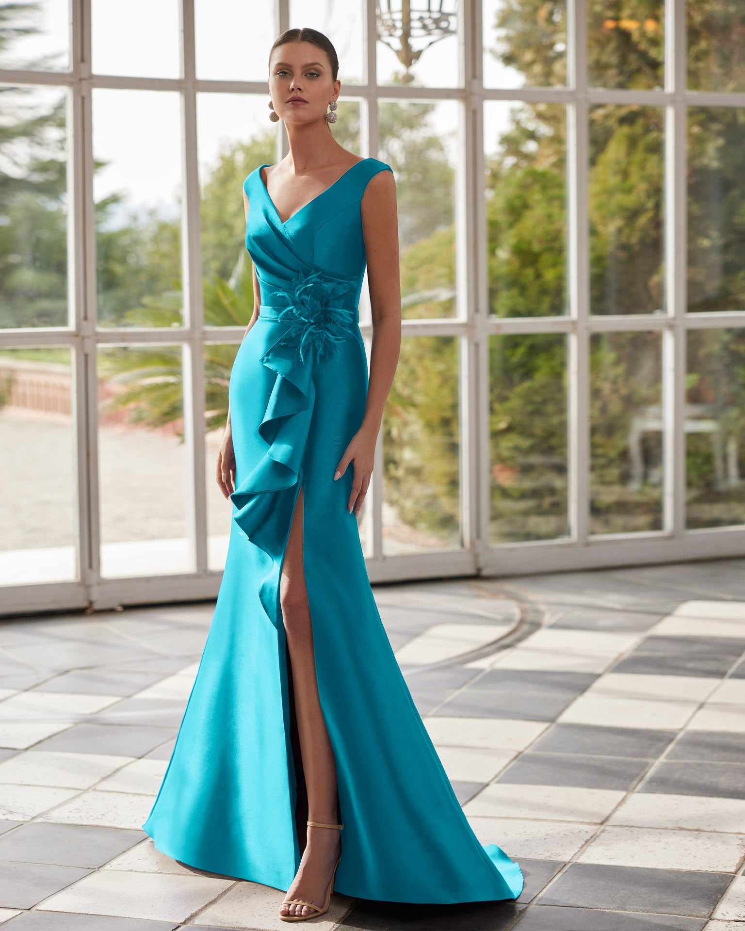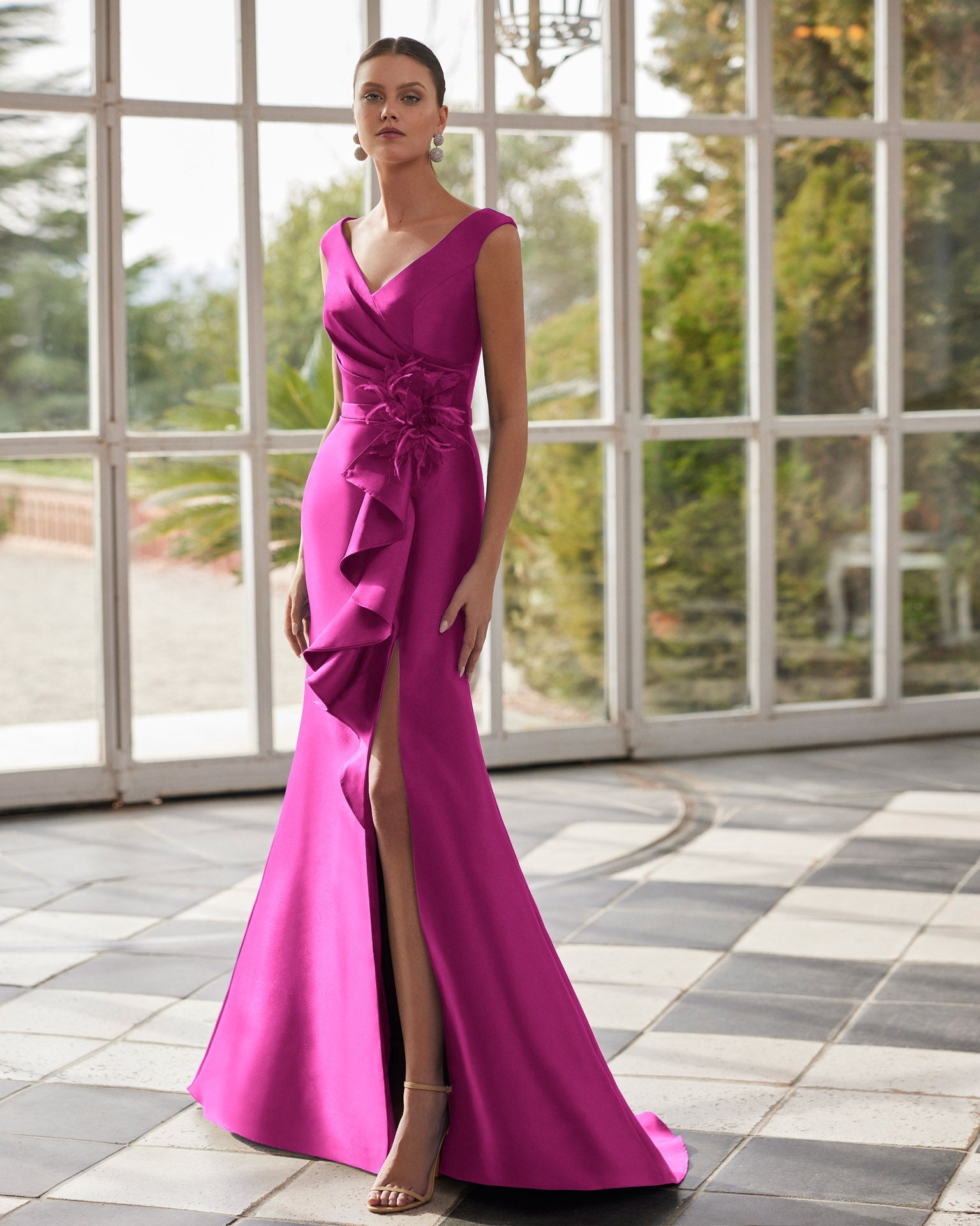 Long dress crafted in mikado, with V-neckline, back zip and straps. The skirt with a side slit completes the design. A Marfil Barcelona look.