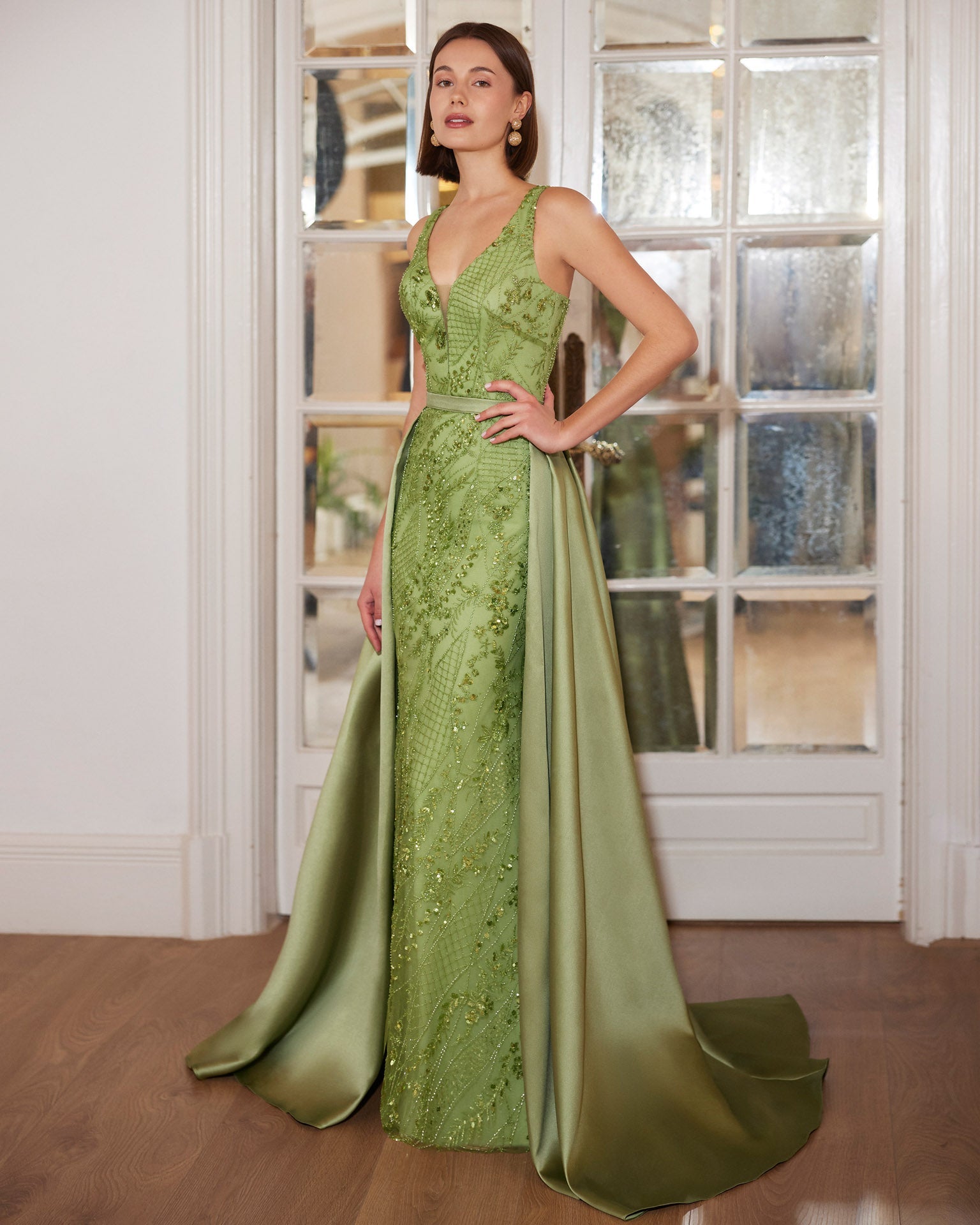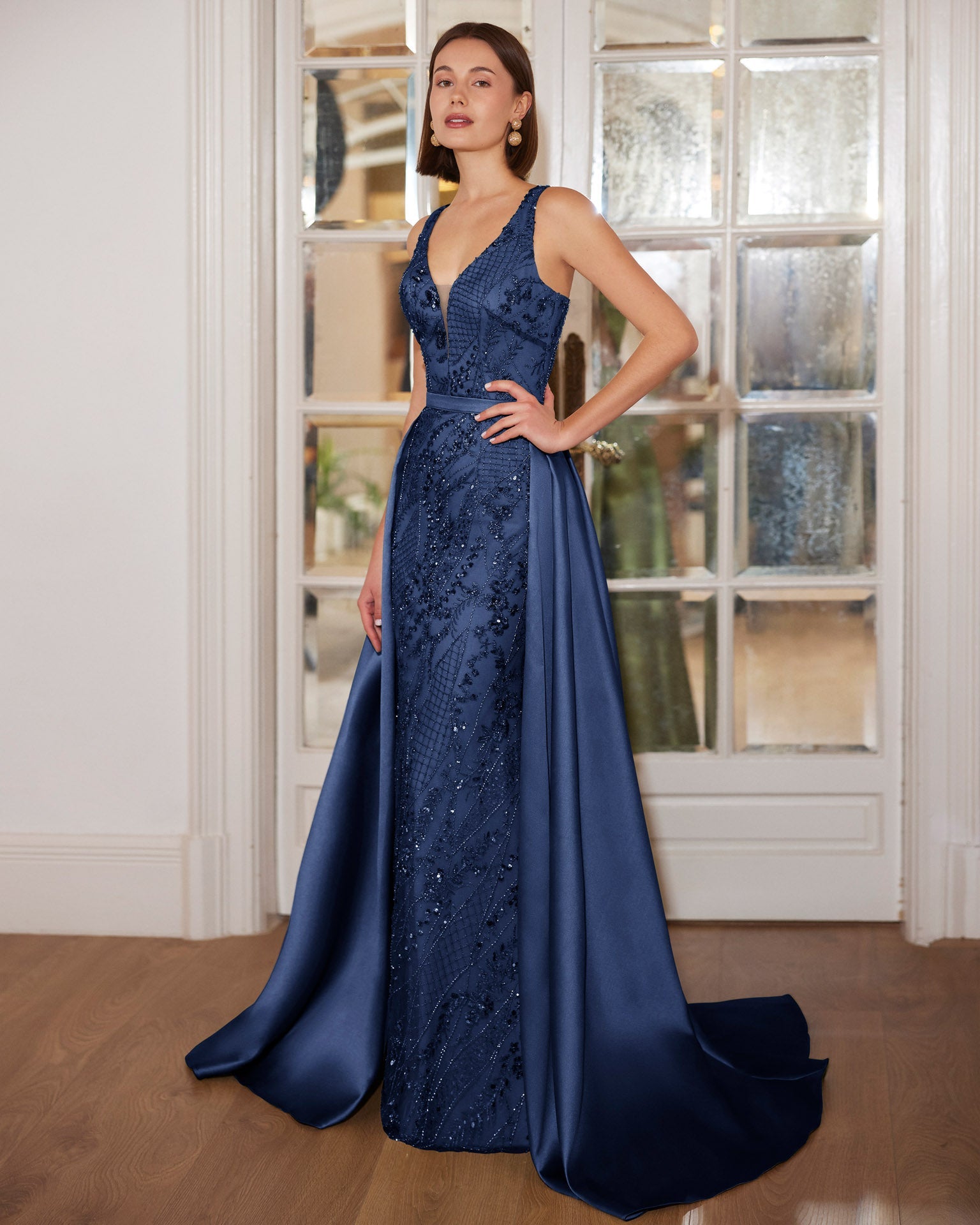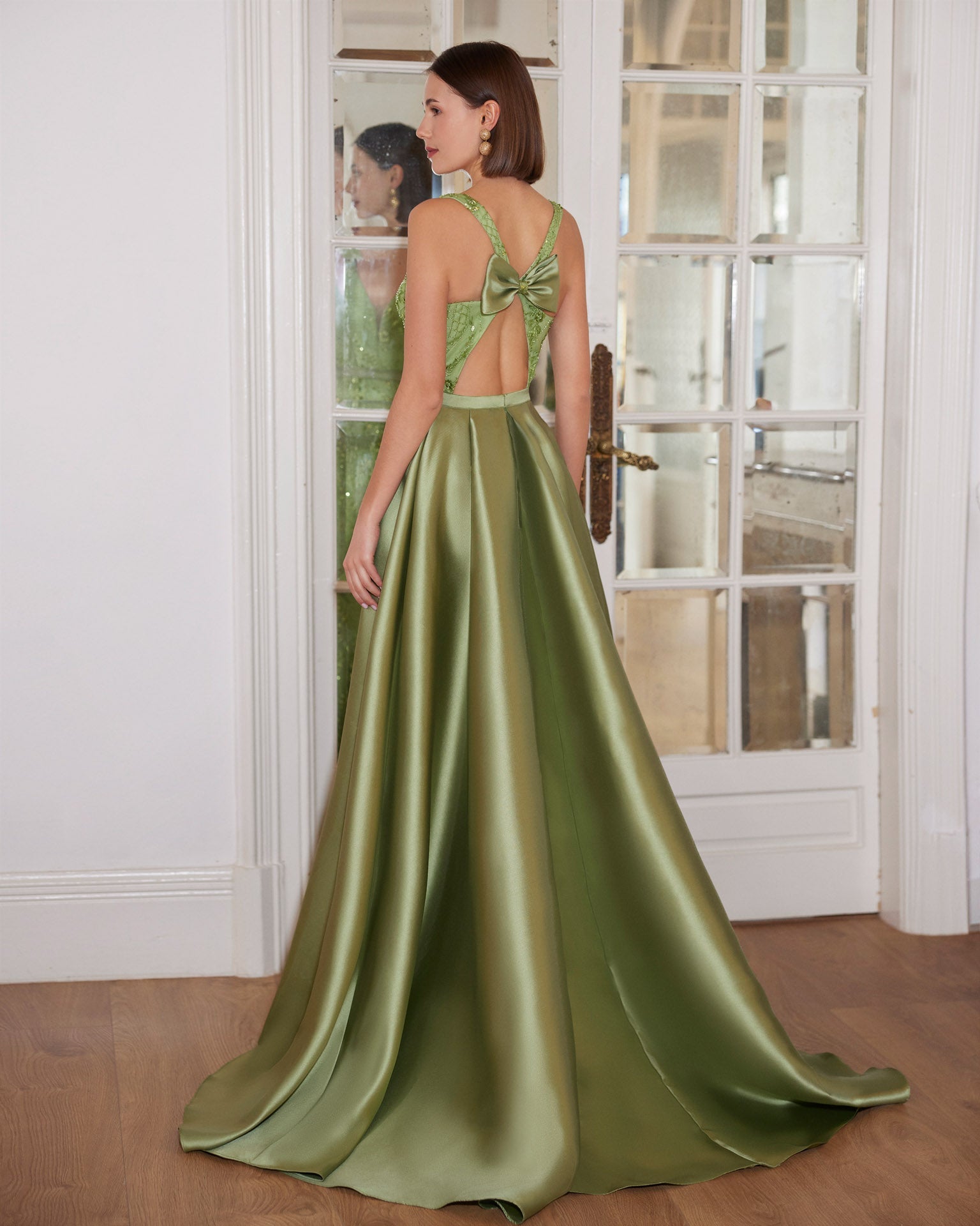 Two-piece long evening dress crafted in mikado with beadwork. Showcase a V-neckline, keyhole back, straps, decorative back bow and an overskirt. A Marfil Barcelona look.