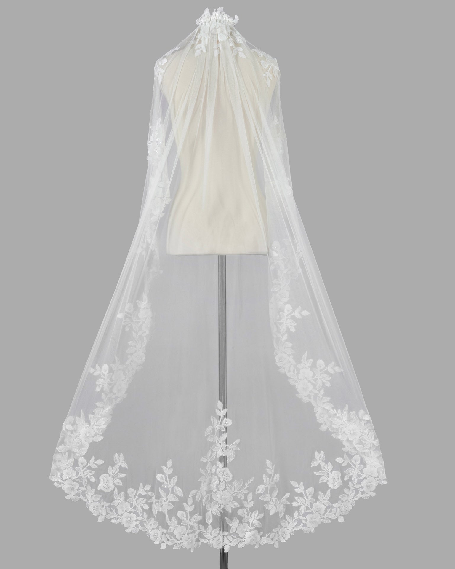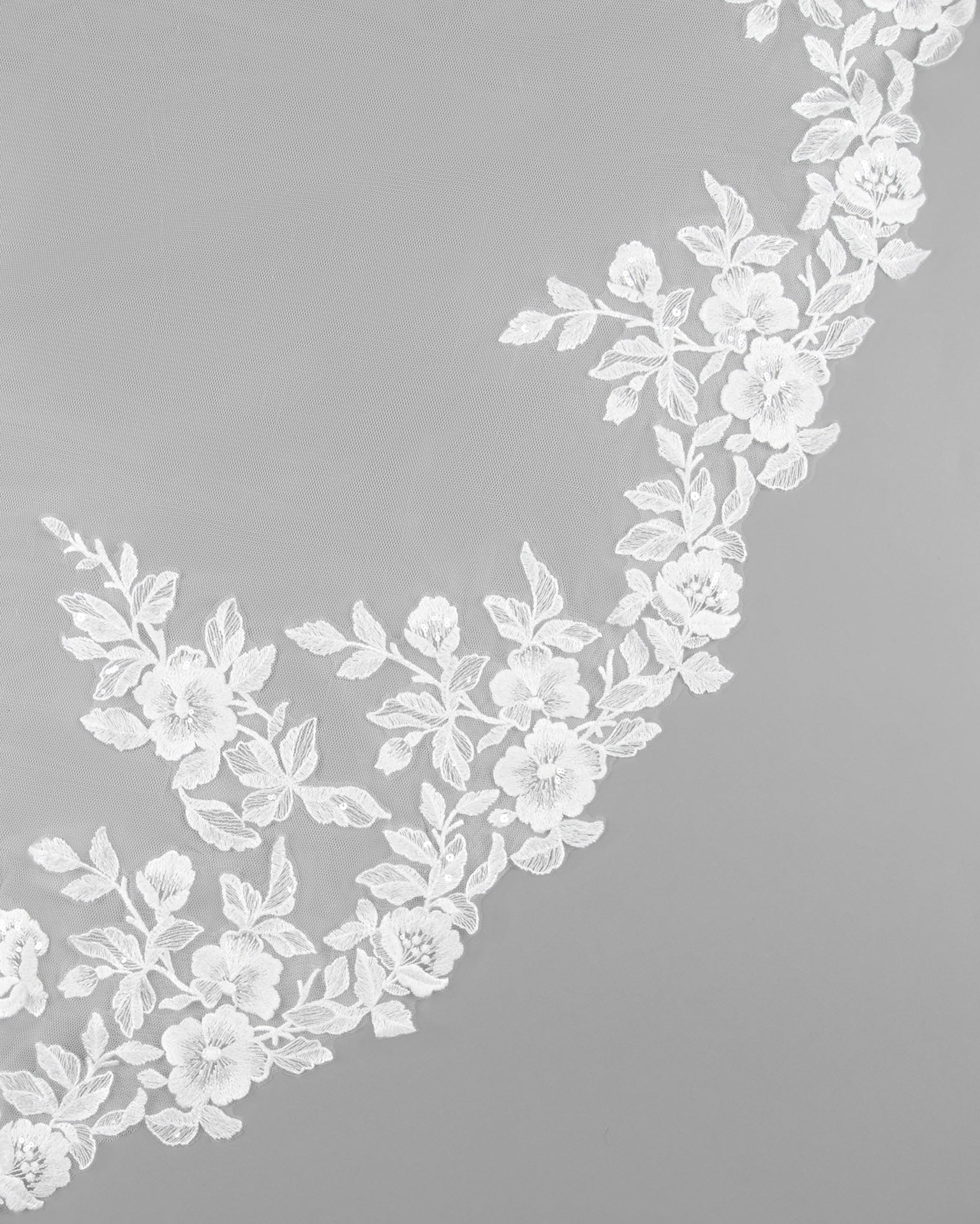 Tulle, lace, and beadwork bridal veil with comb and pearls.
