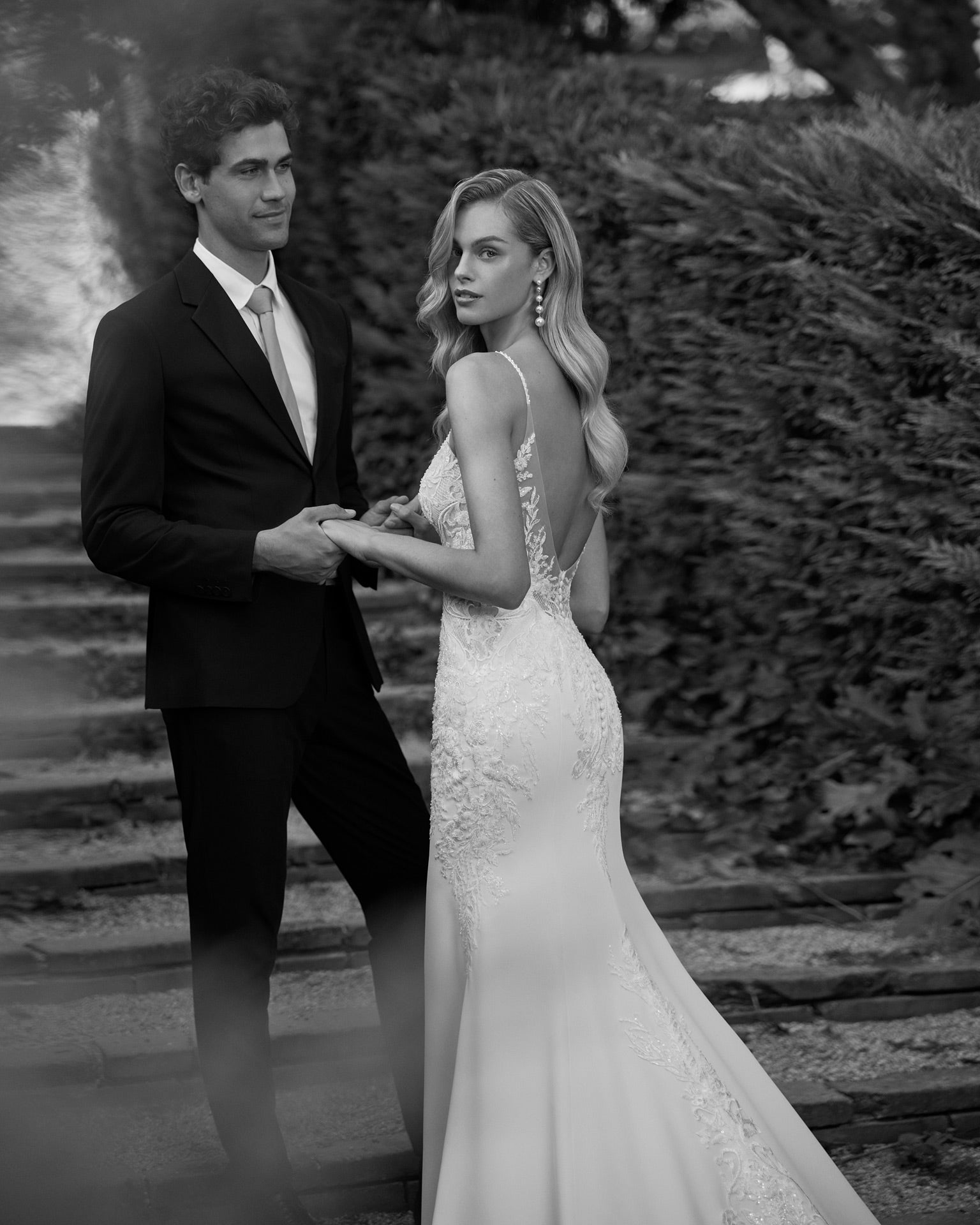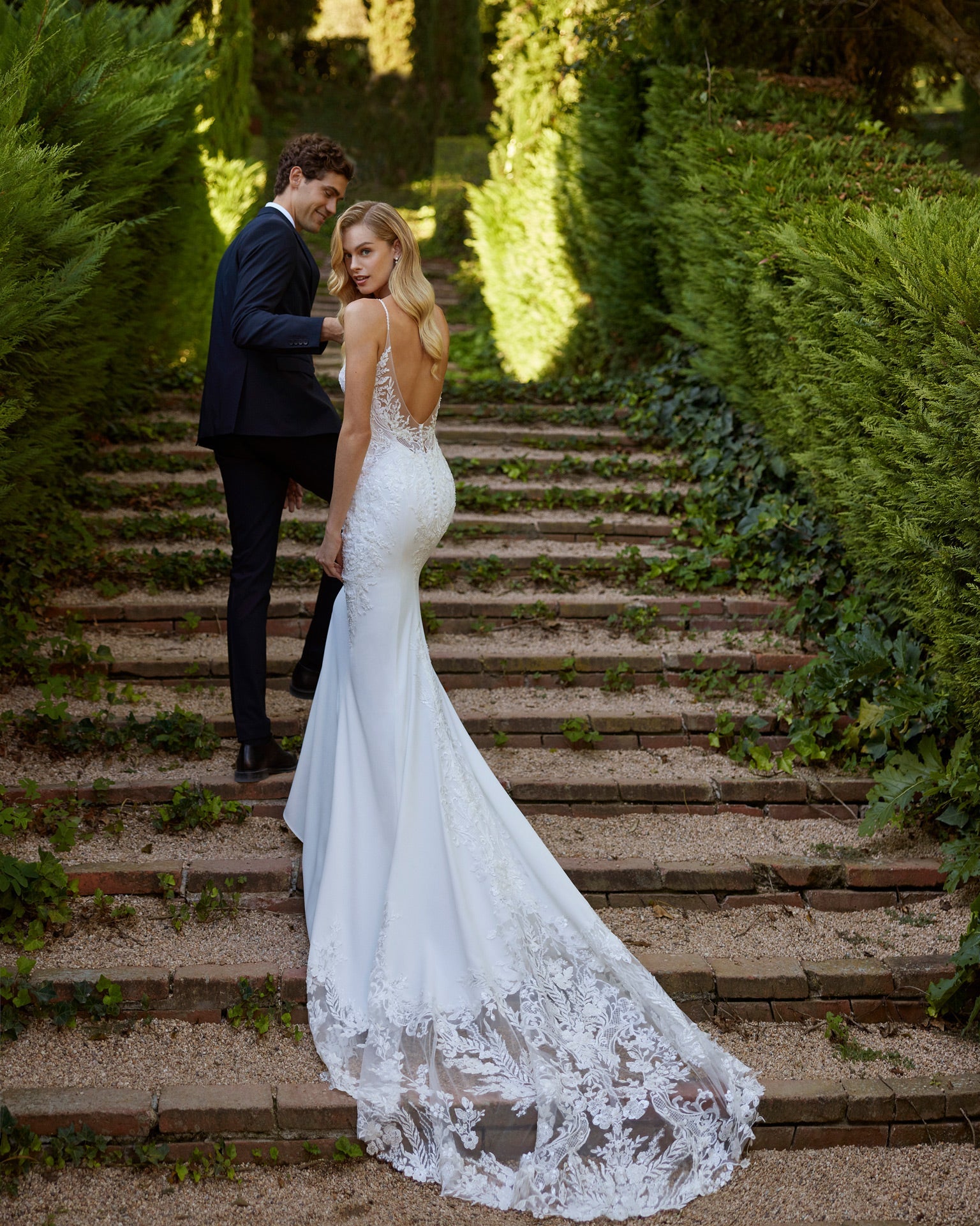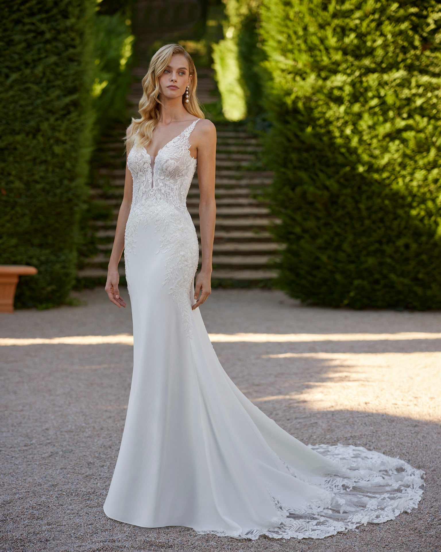 Romantic mermaid wedding dress crafted in stretch crêpe combined with lace and beadwork. Featuring a plunging neckline, V-back and train in lace and beadwork. A dreamy Adriana Alier gown.