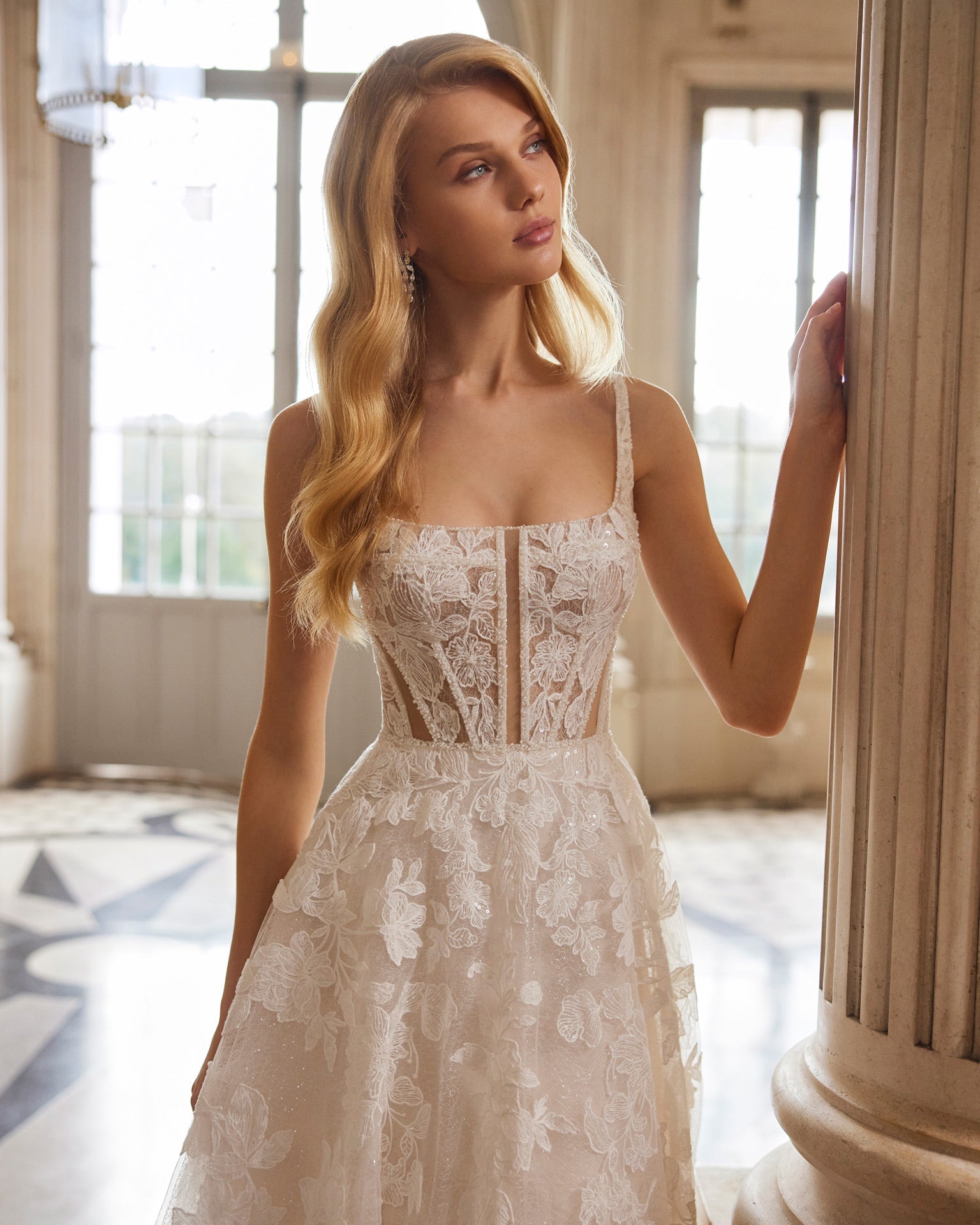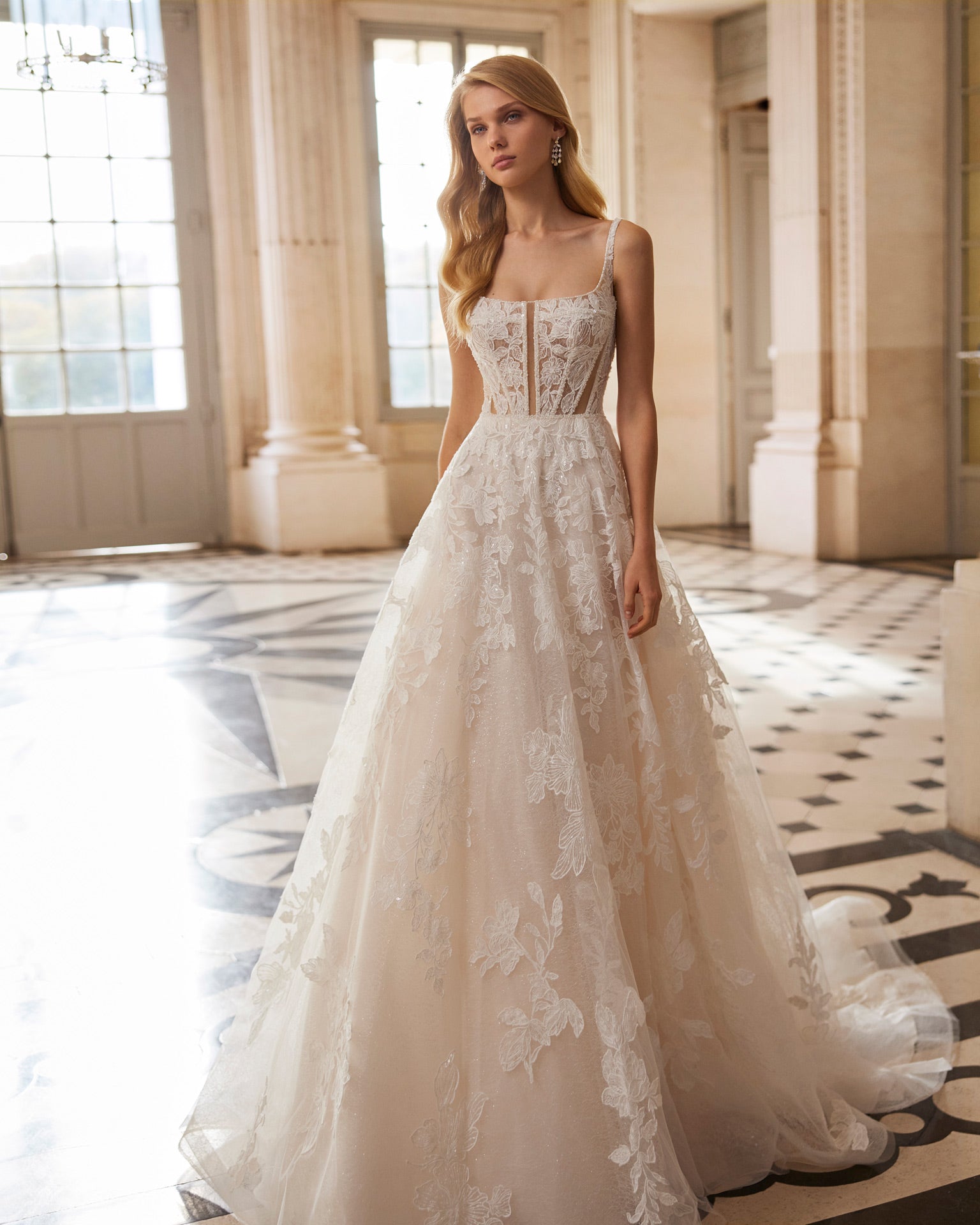 Long A-line princess wedding dress, made in lace with a tulle skirt. Featuring a square neckline, plunging back with beadwork straps and skirt in floral lace with glitter tulle. A dreamy Rosa Clará Dreams design.