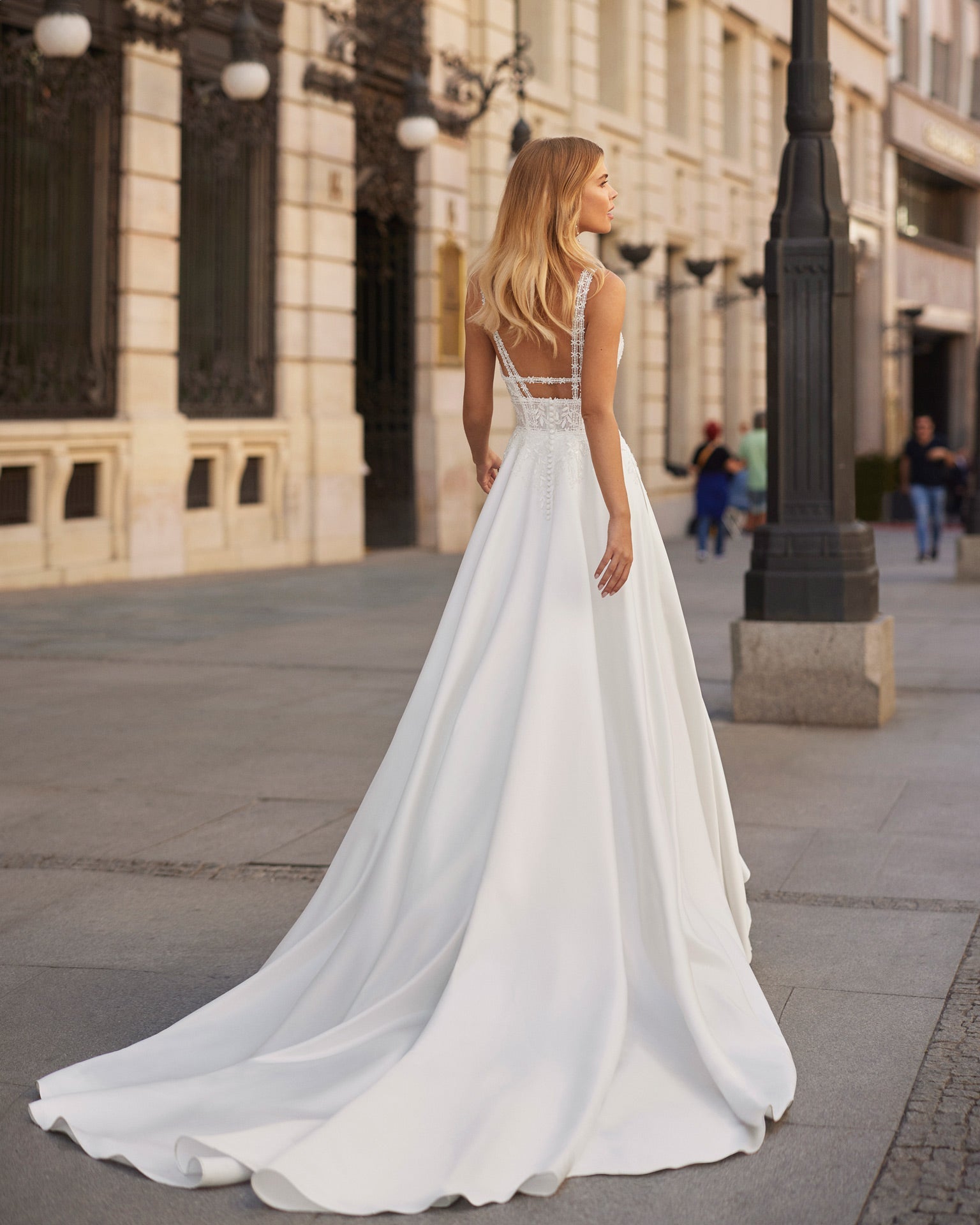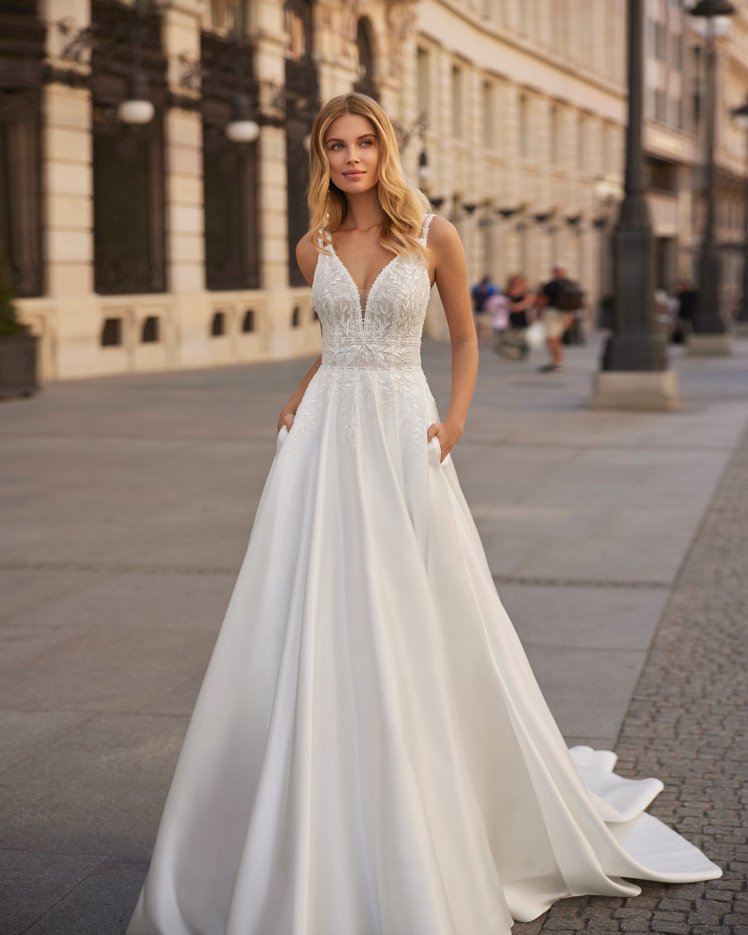 Wedding dress version, mikado, beaded lace. Luna Novias.