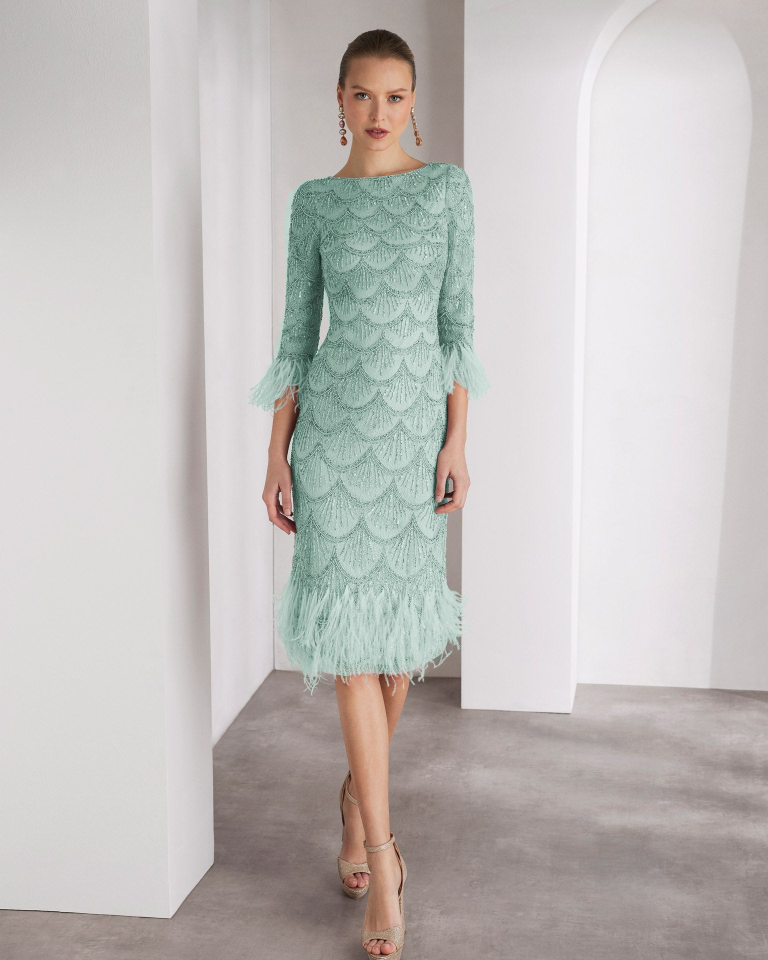 Elegant short evening dress crafted in beadwork combined with feathers. Featuring a bateau neckline, V-back and long sleeve. A Rosa Clará Cocktail look.