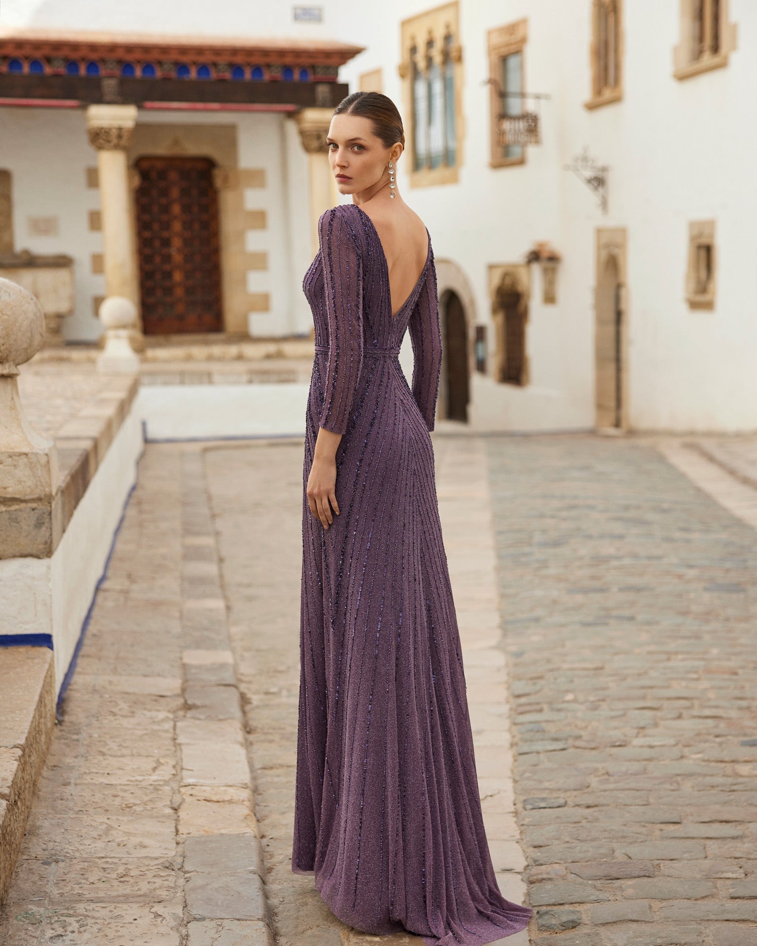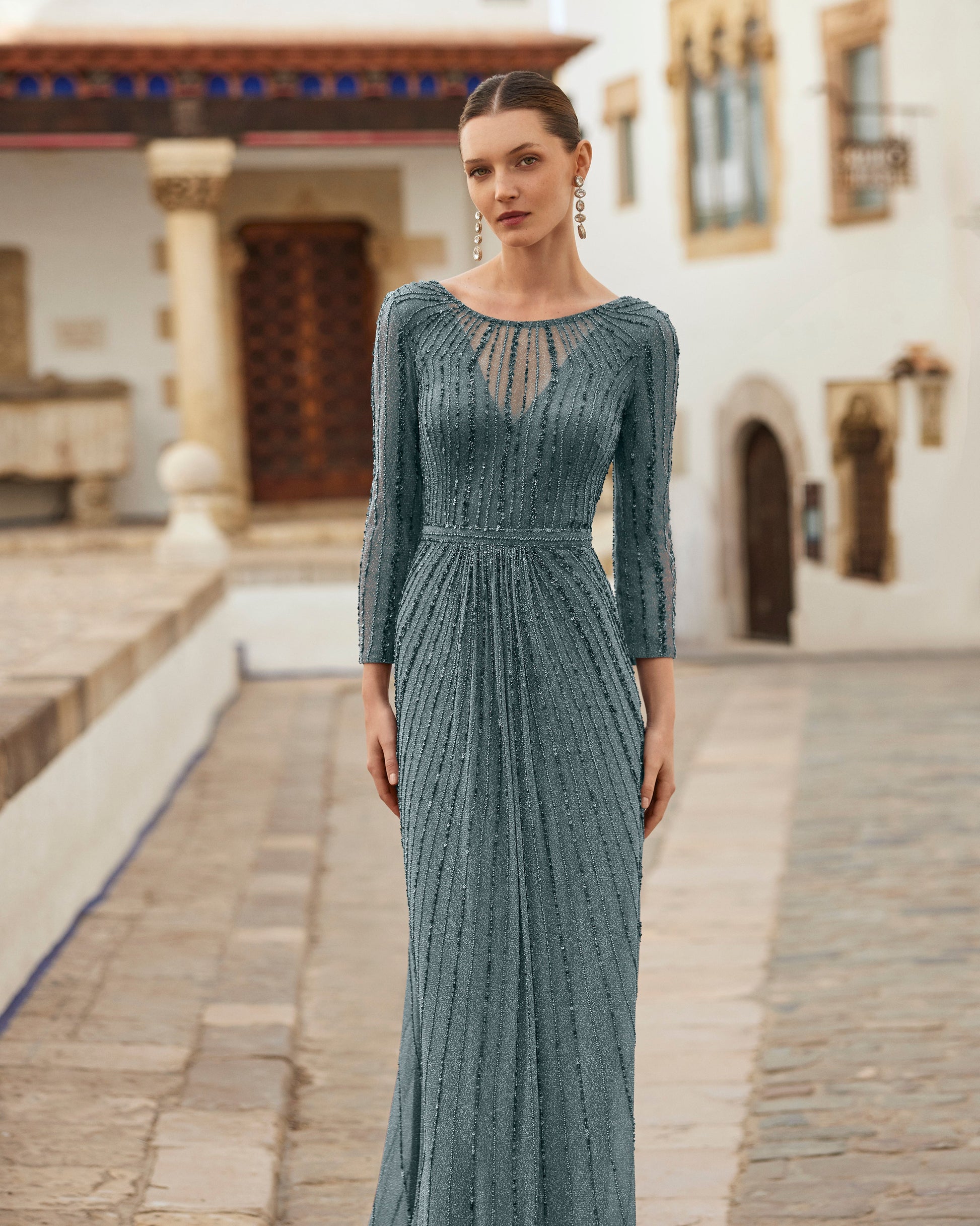 Formal long evening dress, crafted in beadwork combined with sequins. Featuring an illusion neckline, V-back and three-quarter sleeve. An Aire Barcelona look for parties and events.