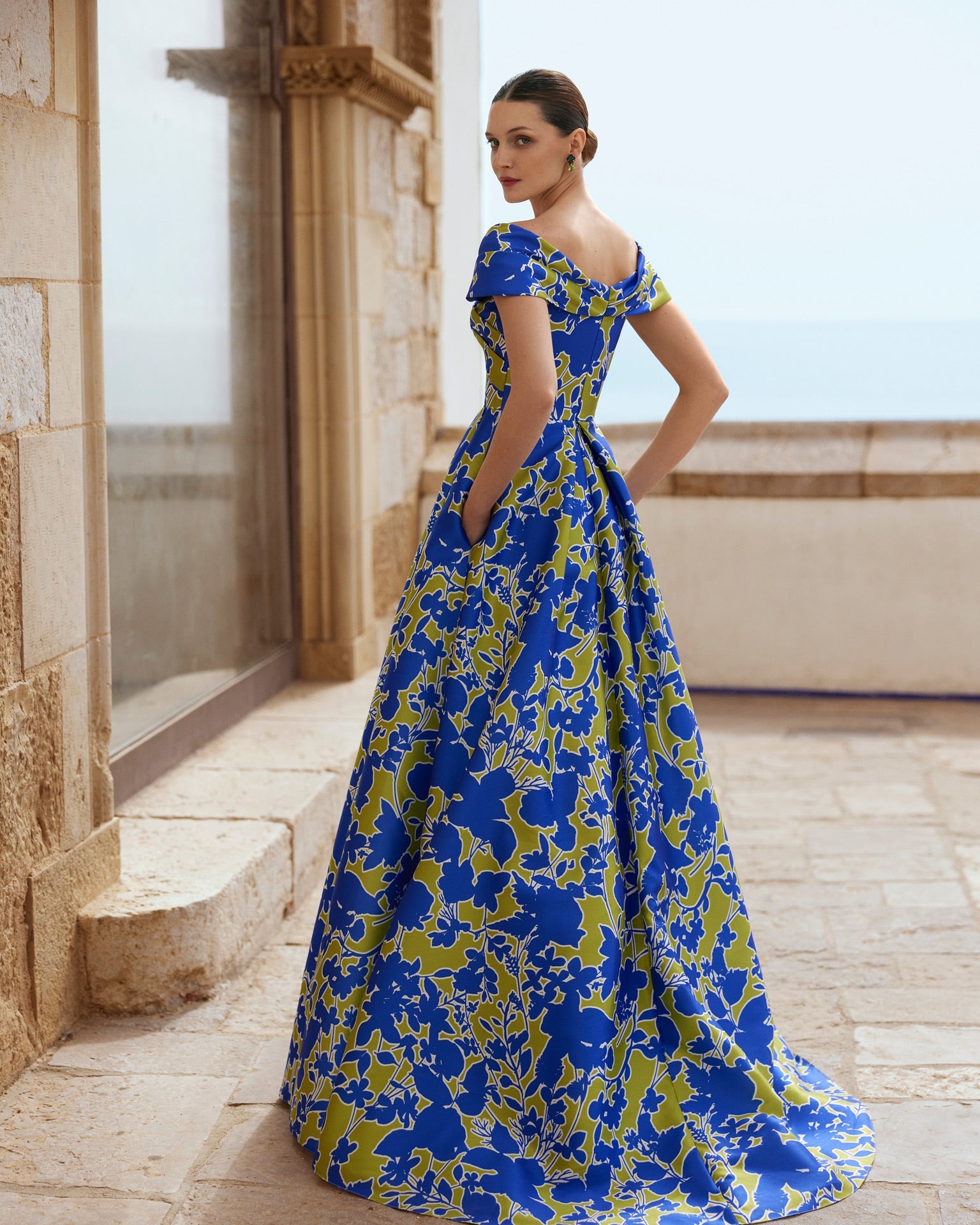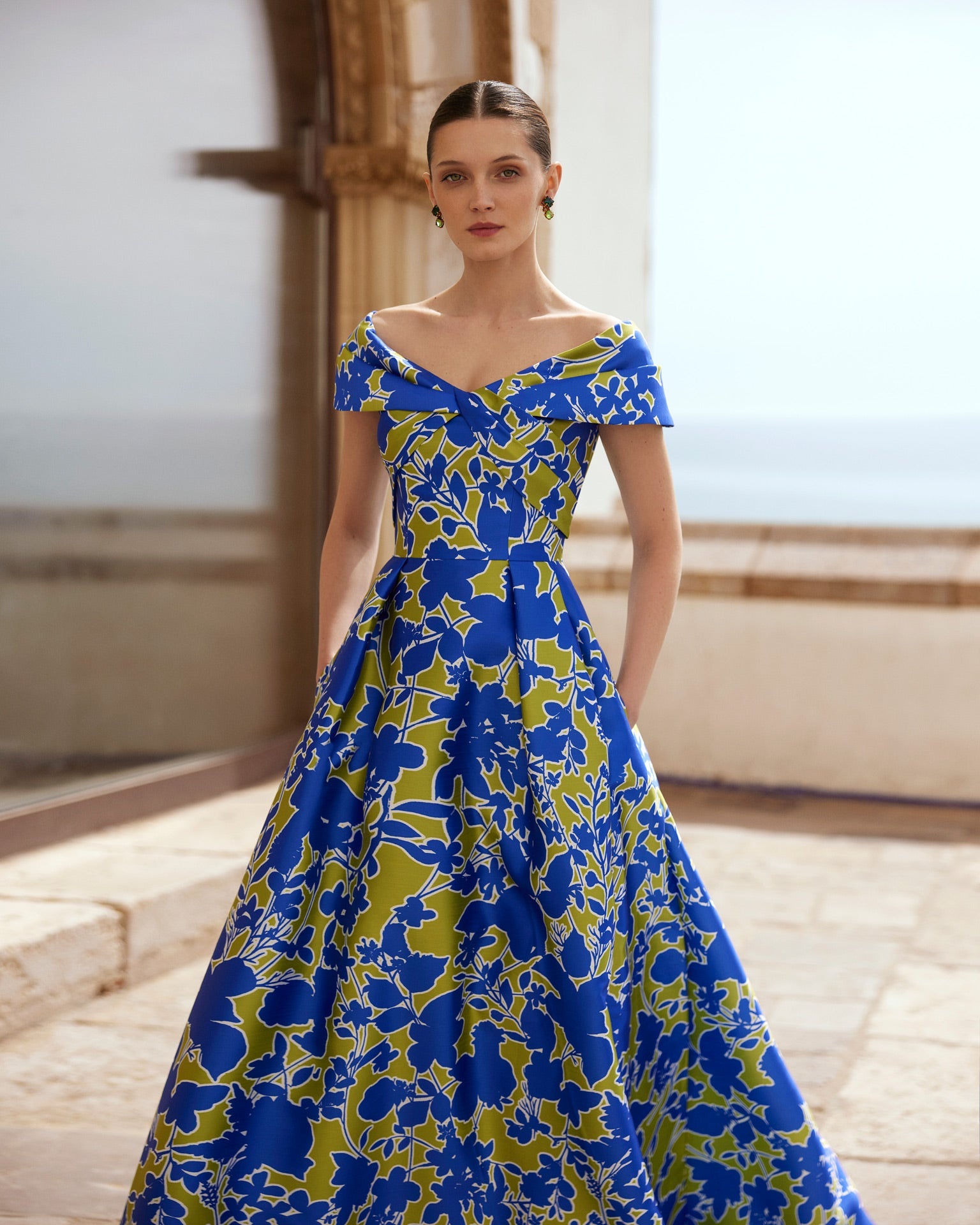 Elegant long guest dress crafted in printed mikado. Featuring an off-shoulder cuff neckline and closed back. An Aire Barcelona look for parties and events.