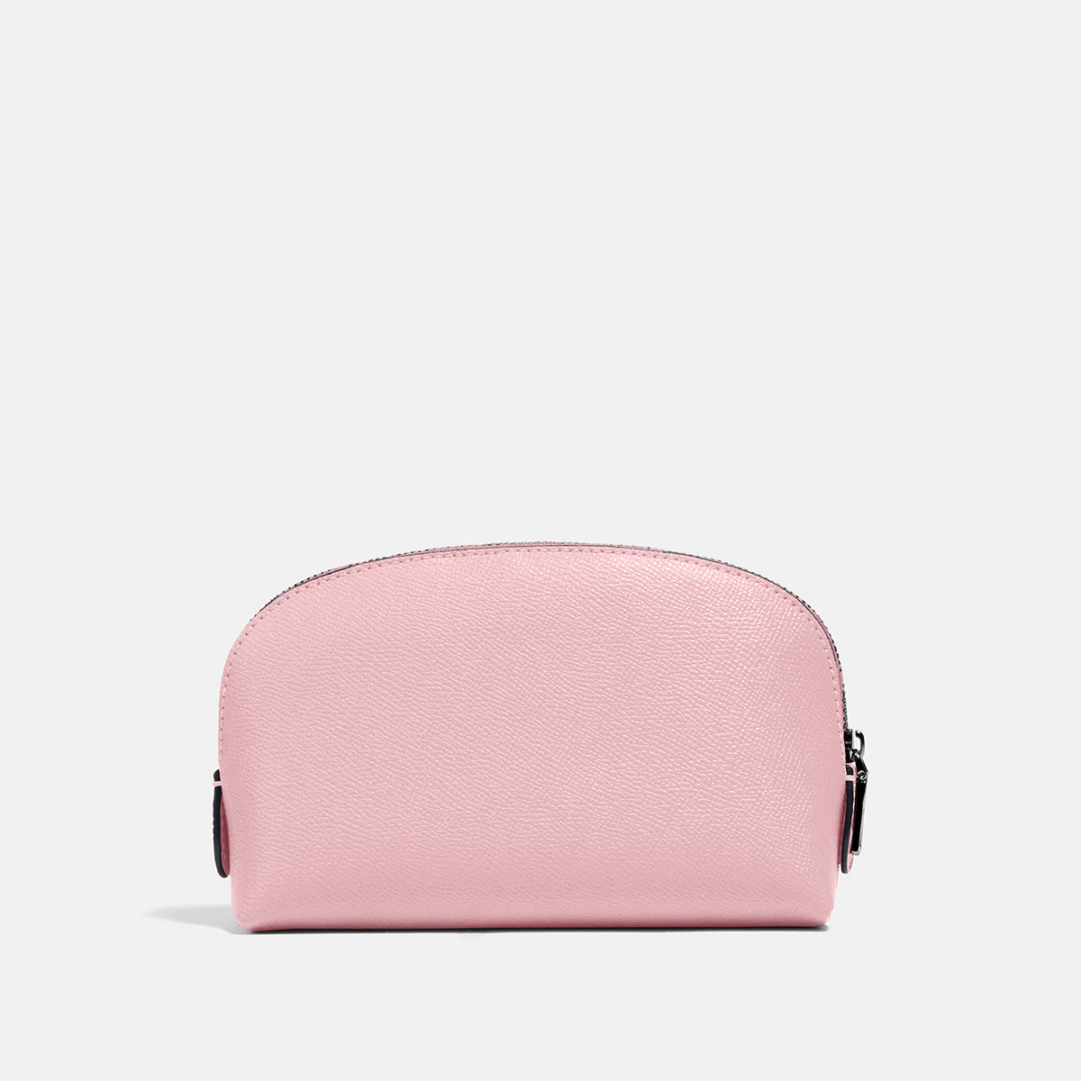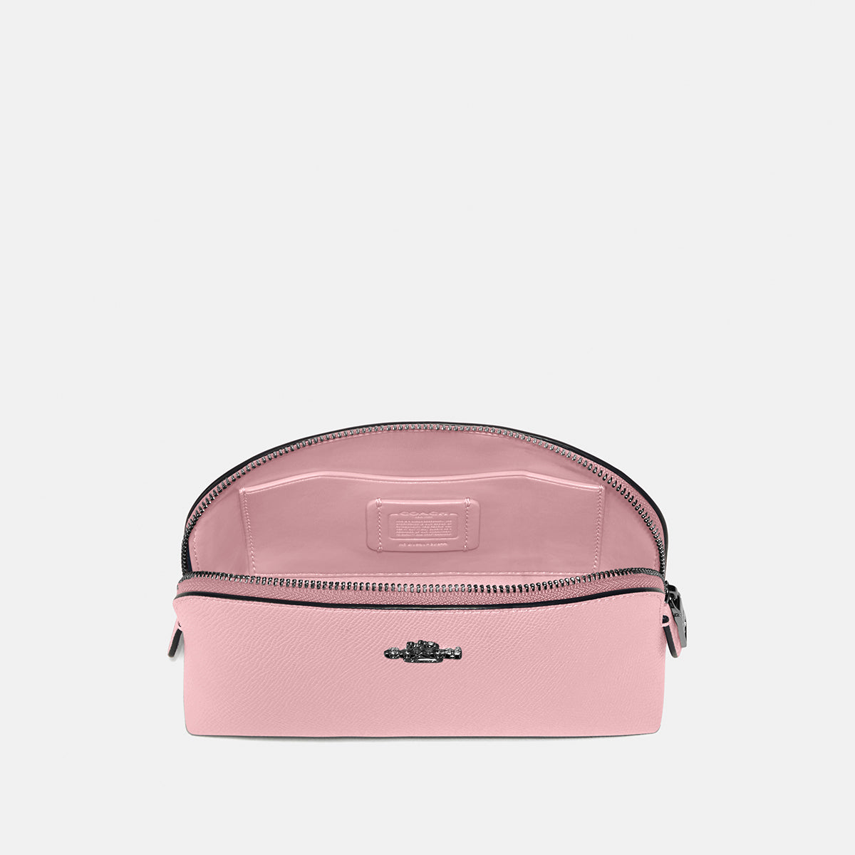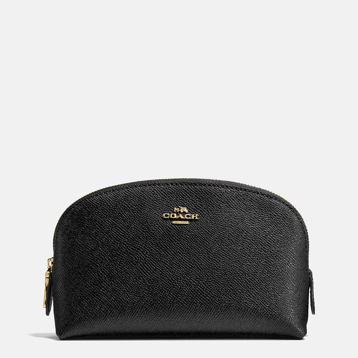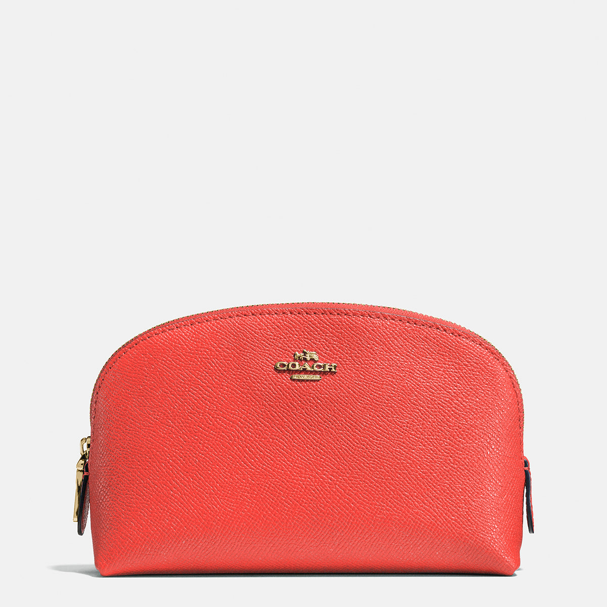 Keep makeup and other small essentials stylishly organized in this petite cosmetic case. It’s crafted from sturdy crossgrain leather with polished metal hardware.