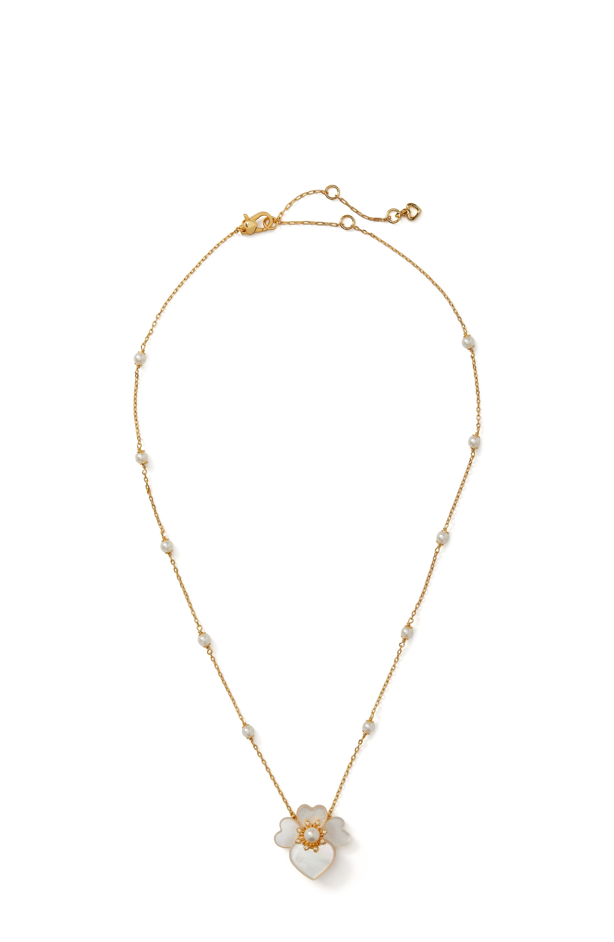 Showcasing a mother-of-pearl pansy inset with acrylic pearl and sparkle, this precious statement pendant is sure to elicit some oohs and ahhs from passersby...