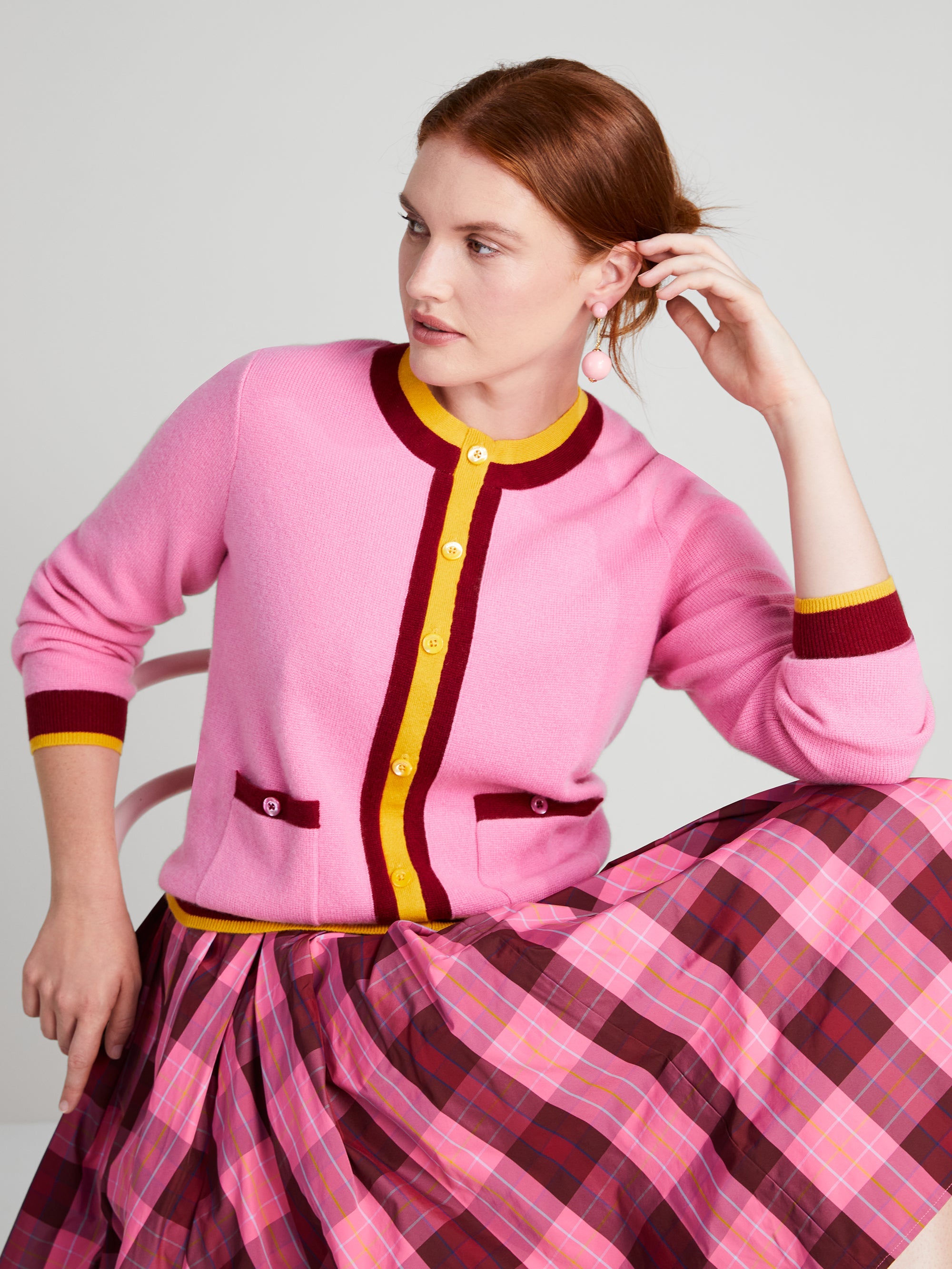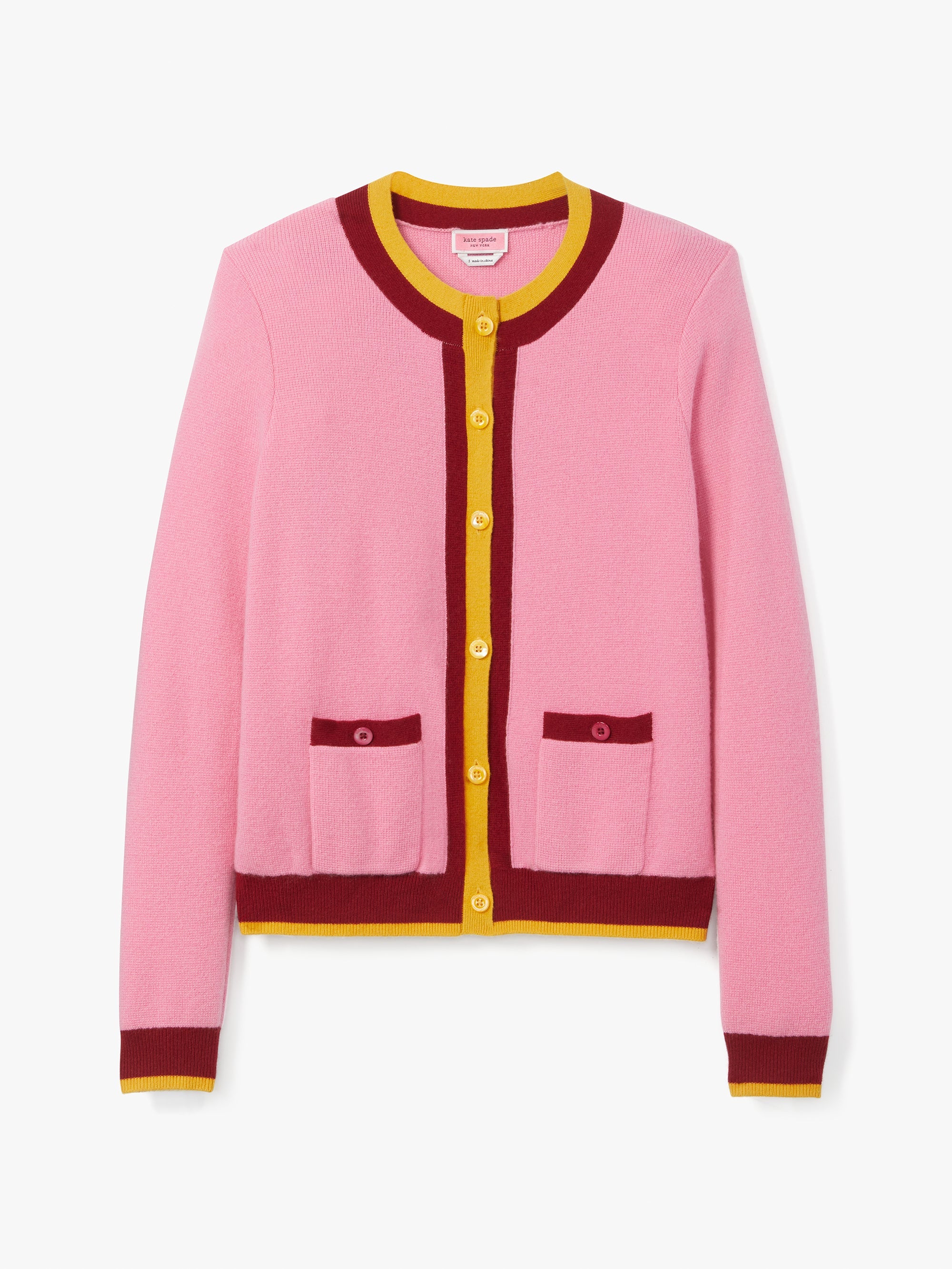 Too many sweaters? Never. Add this one, showcasing colorful contrast trim and shiny gold-tone buttons, to the collection.