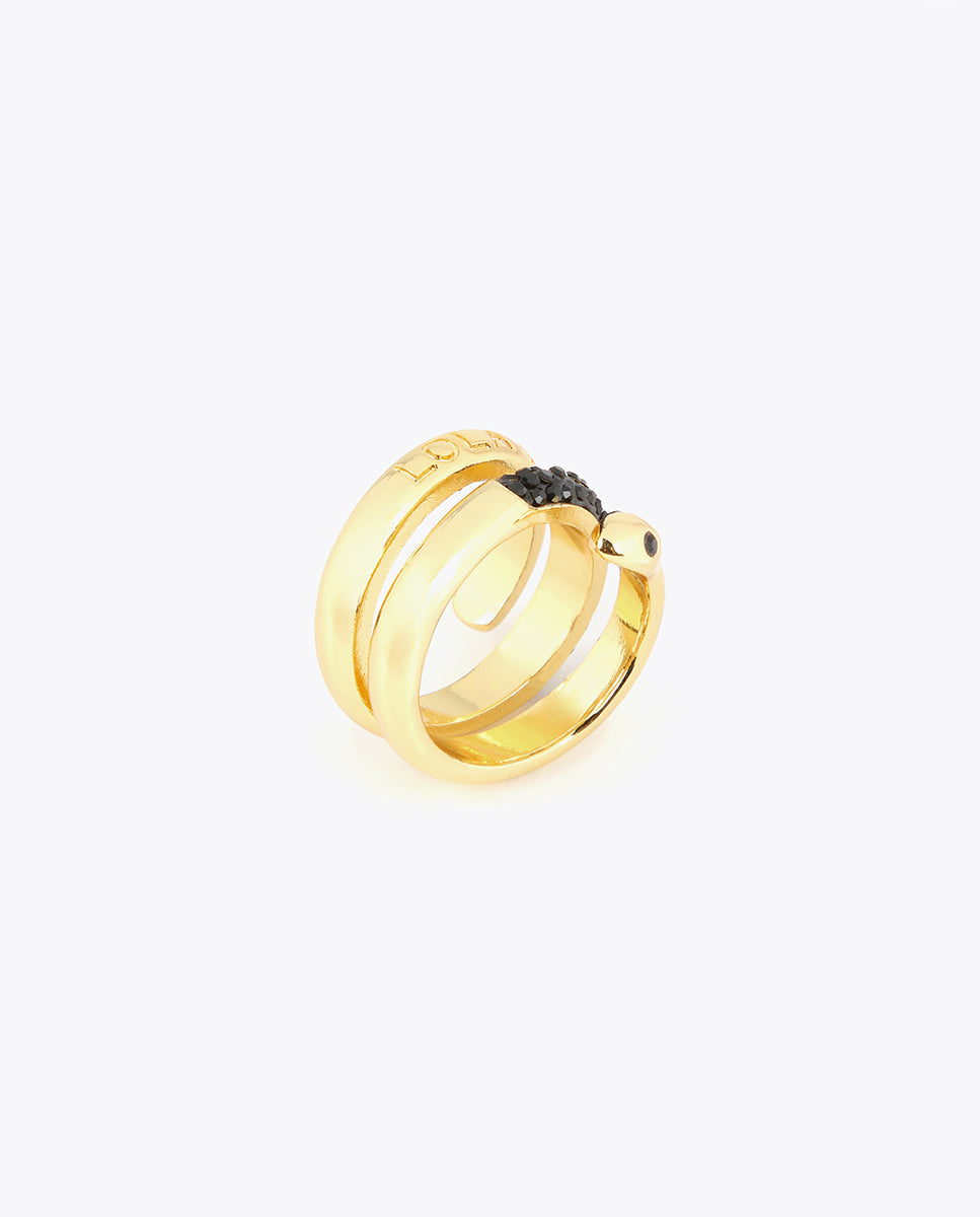 Golden snake ring with sparkly rhinestones and engraved logo.