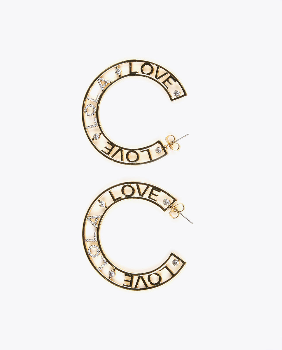 Open, flat hoop earrings with Lola Love lettering and sparkly stone details.