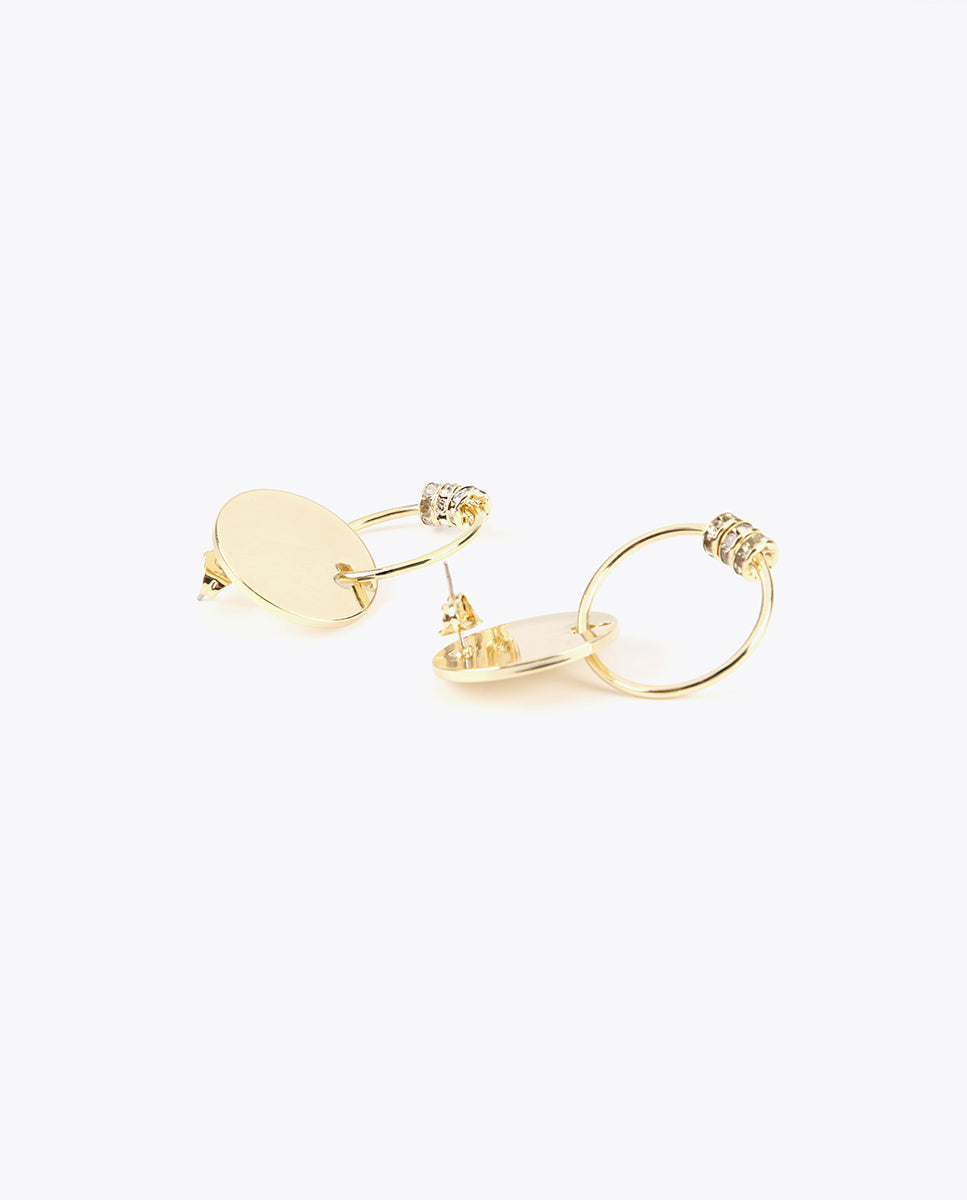 Gold-toned stud earrings with rhinestones and hoop pendant with charms.