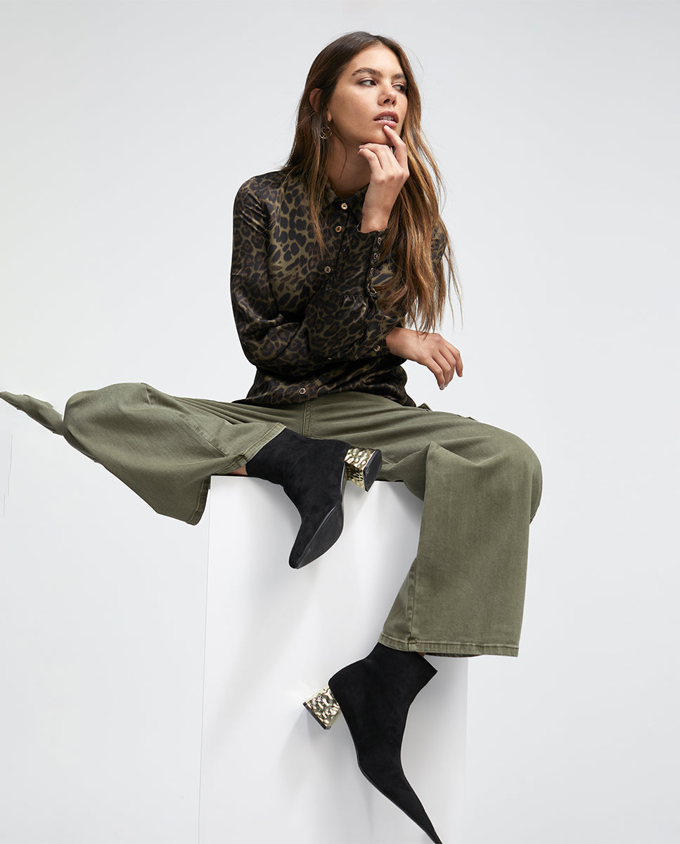 Black ankle boots with golden heel with velvet effect embossing. Zip fastening at the back. Gold logo lettering detail.