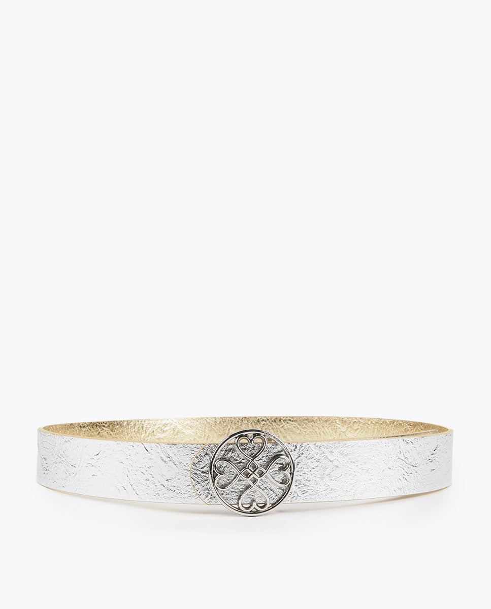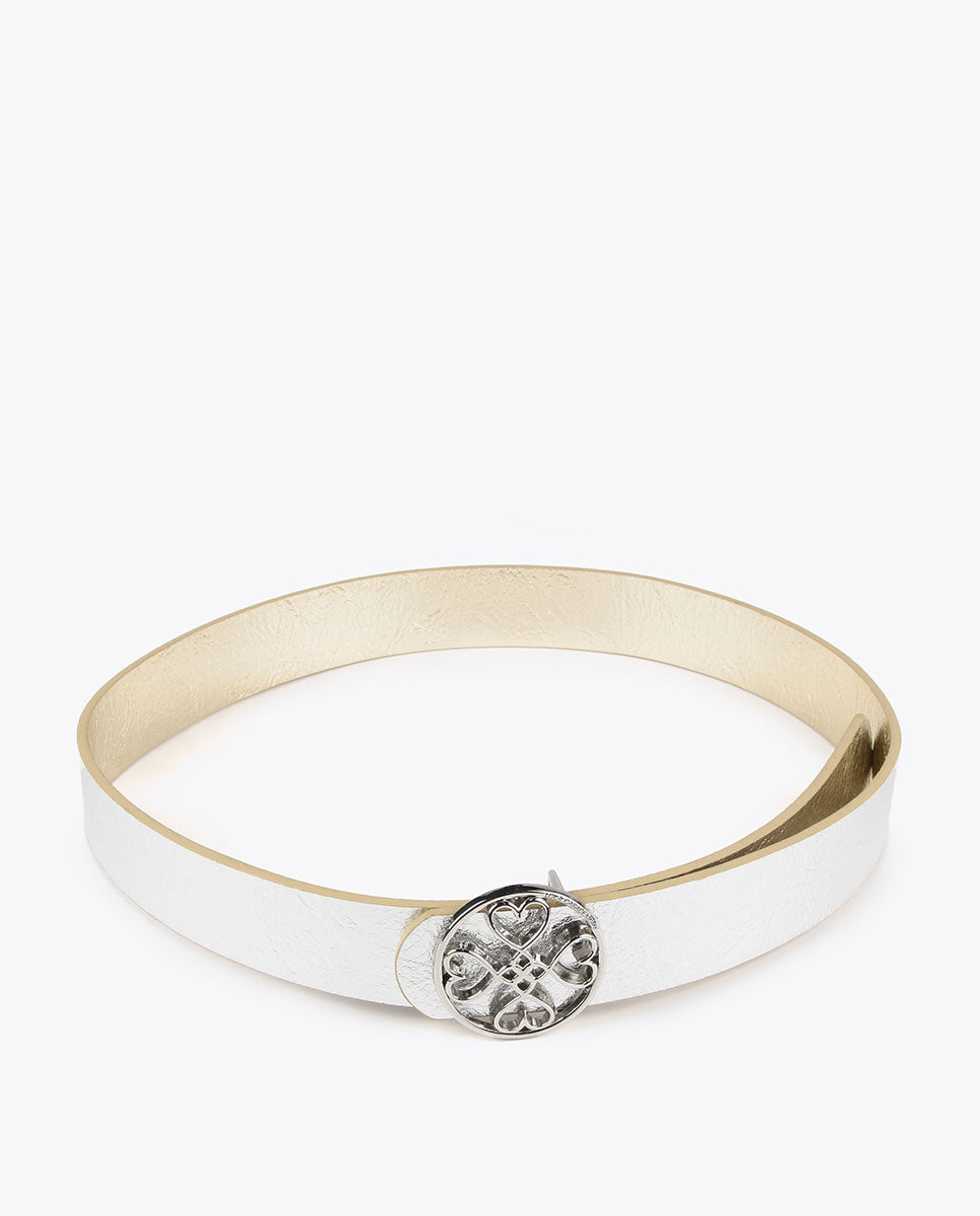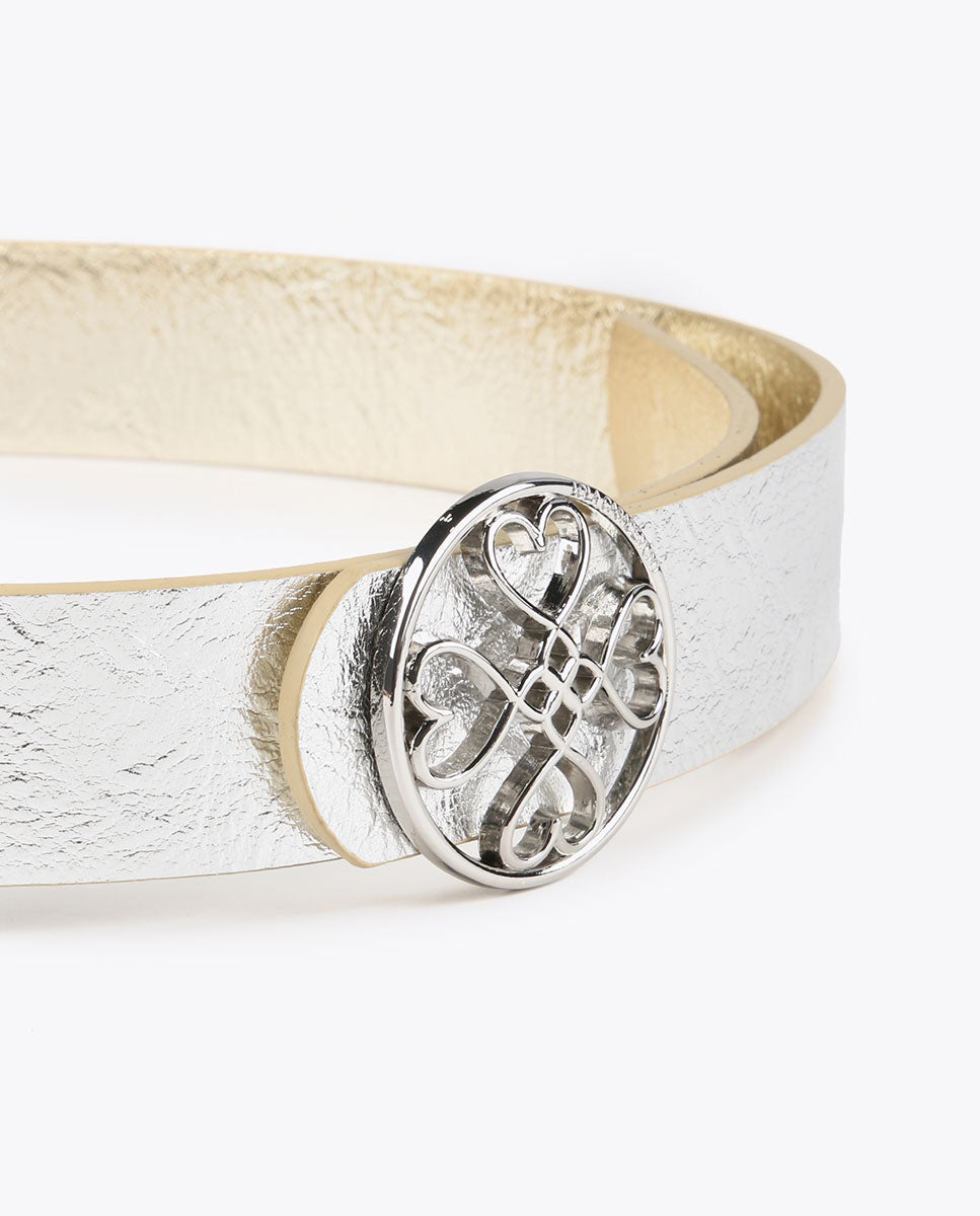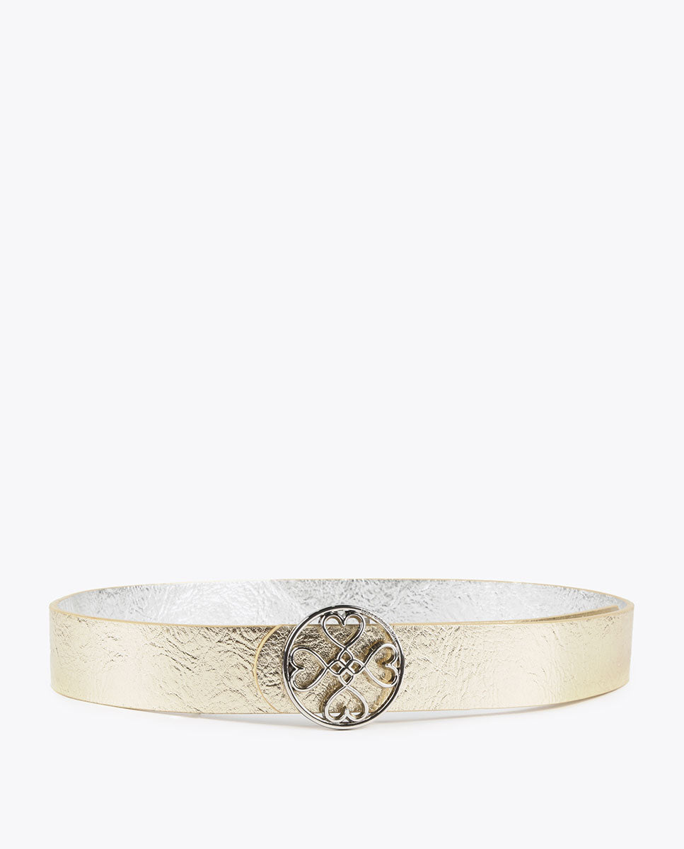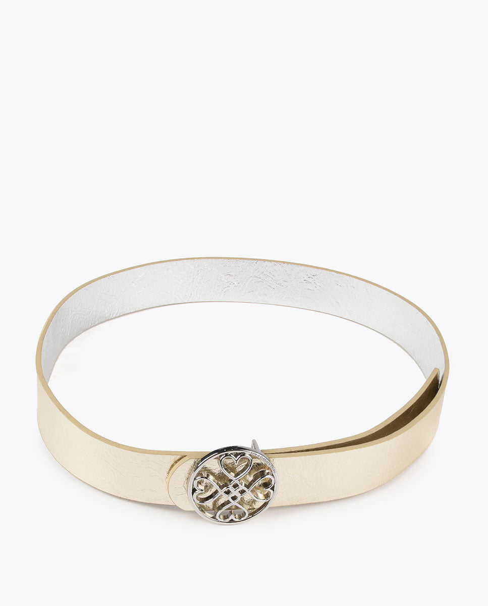 Reversible faux leather belt with a golden buckle and infinity hearts.