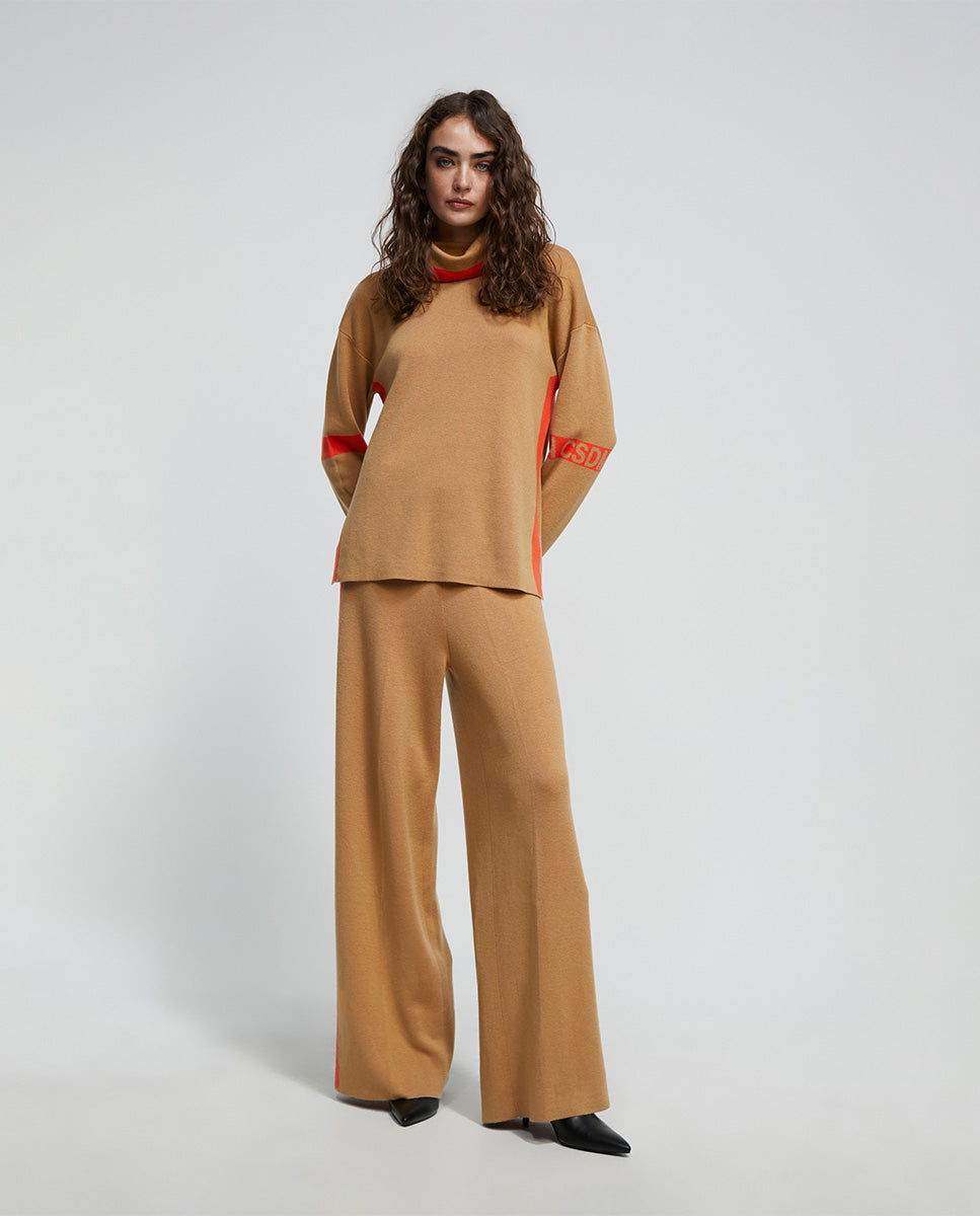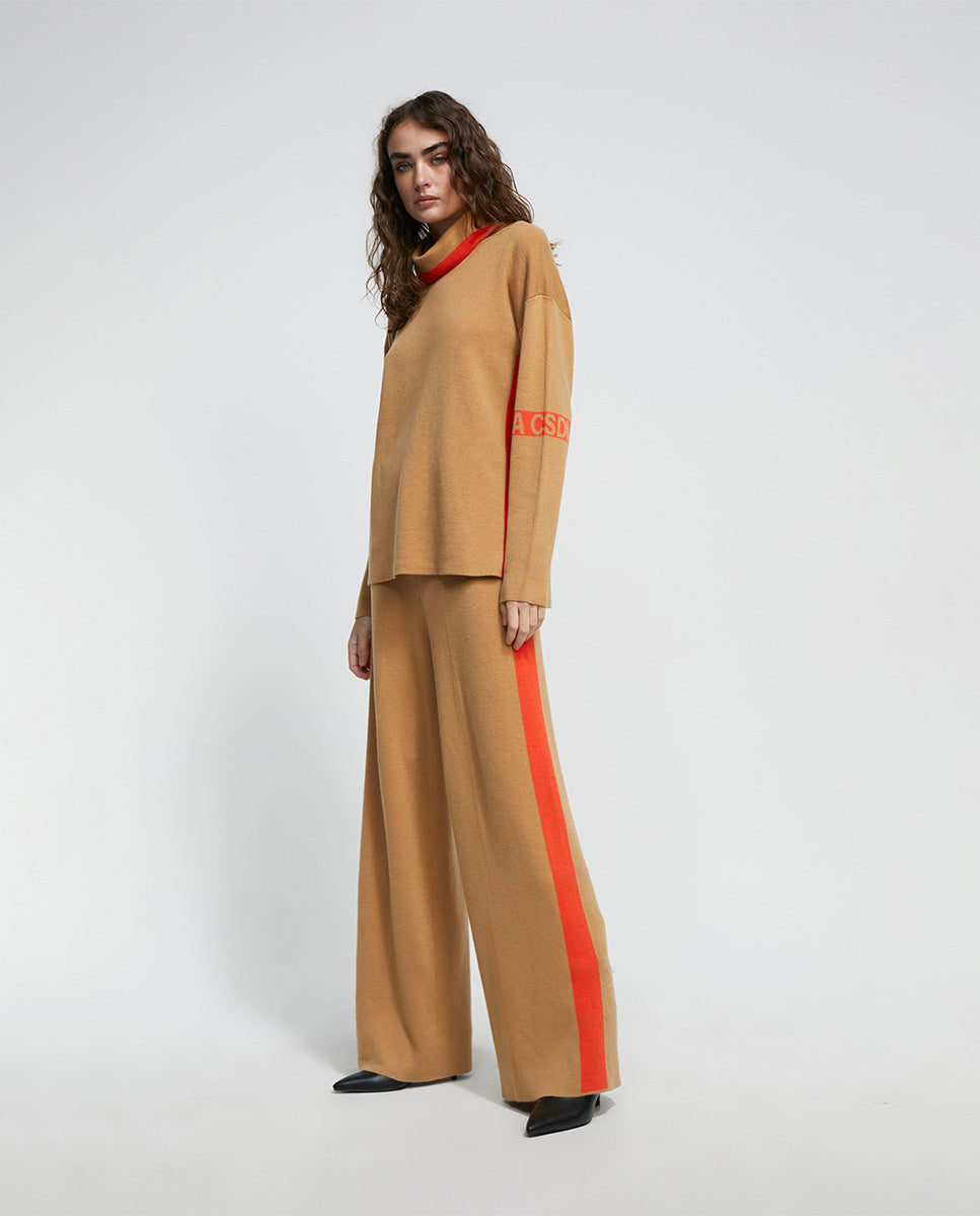Loose-fitting knit sweater with a high neck. Coloured detail on the sides, sleeves and neck.