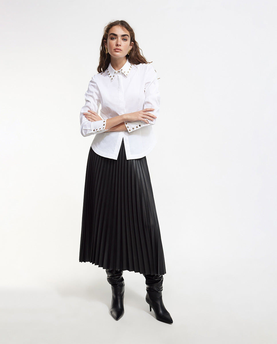 Fitted shirt. Metal studs on the collar and shirt cuffs. Fastening with buttons hidden by a placket.