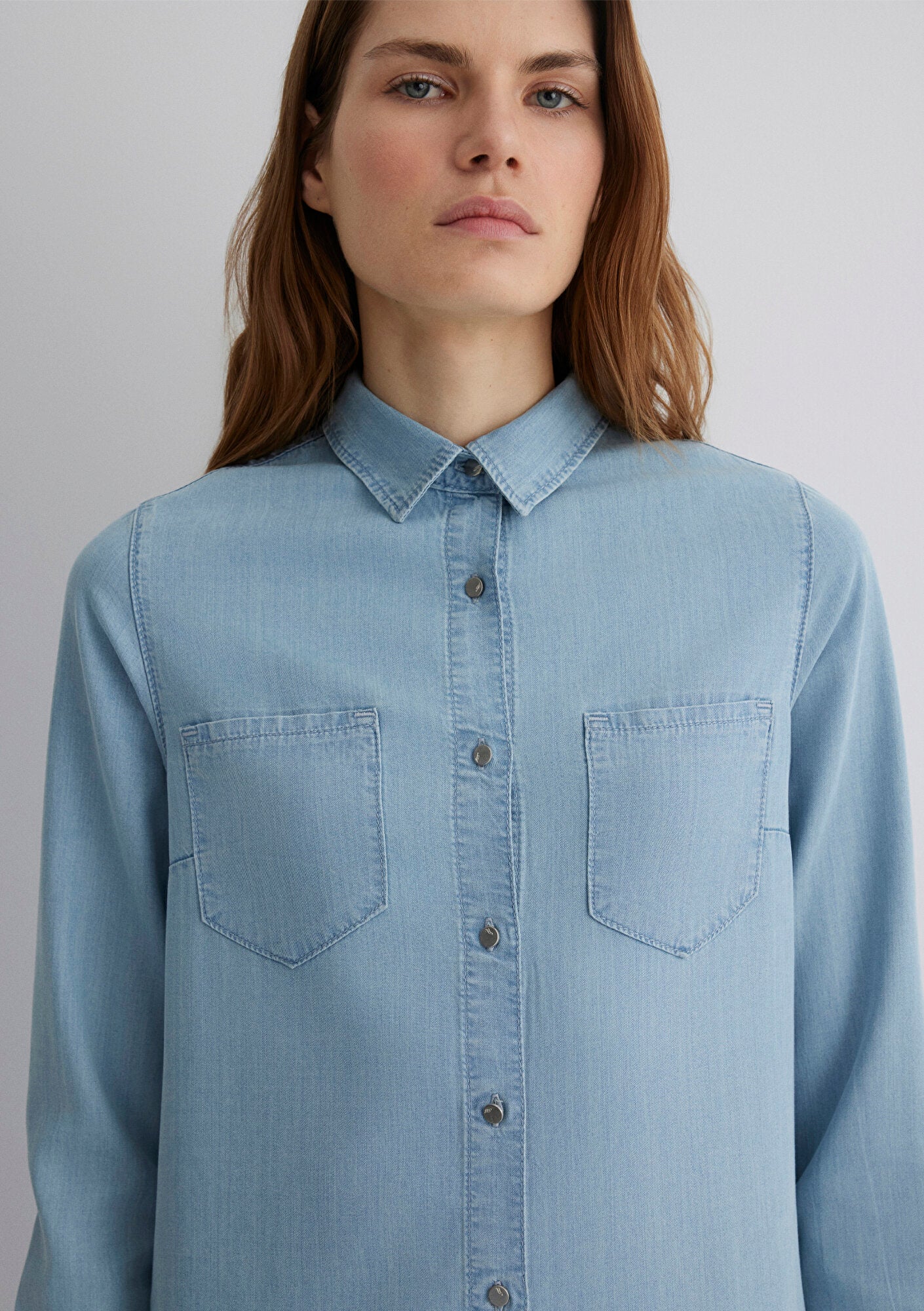Liz Light Blue Gold Premium Jean Dress from Mavi s denim collection. Midi, front-button denim shirt dress. This product is also part of Mavi s sustainable All Blue collection. It is made with TENCEL(TM) certified fabric.