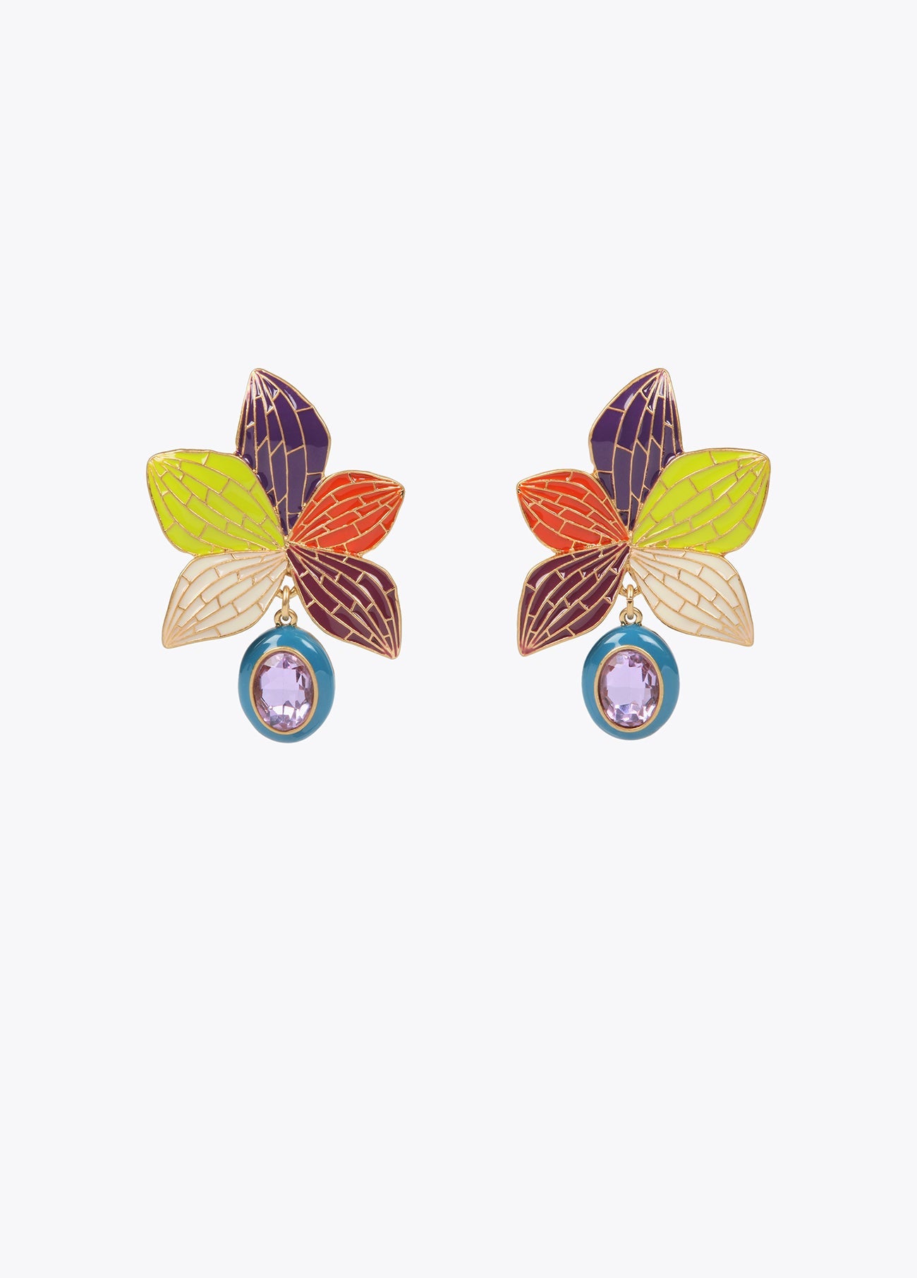 Metal earrings. Coloured orchid detail. Omega and small pin backs. Does not contain nickel.