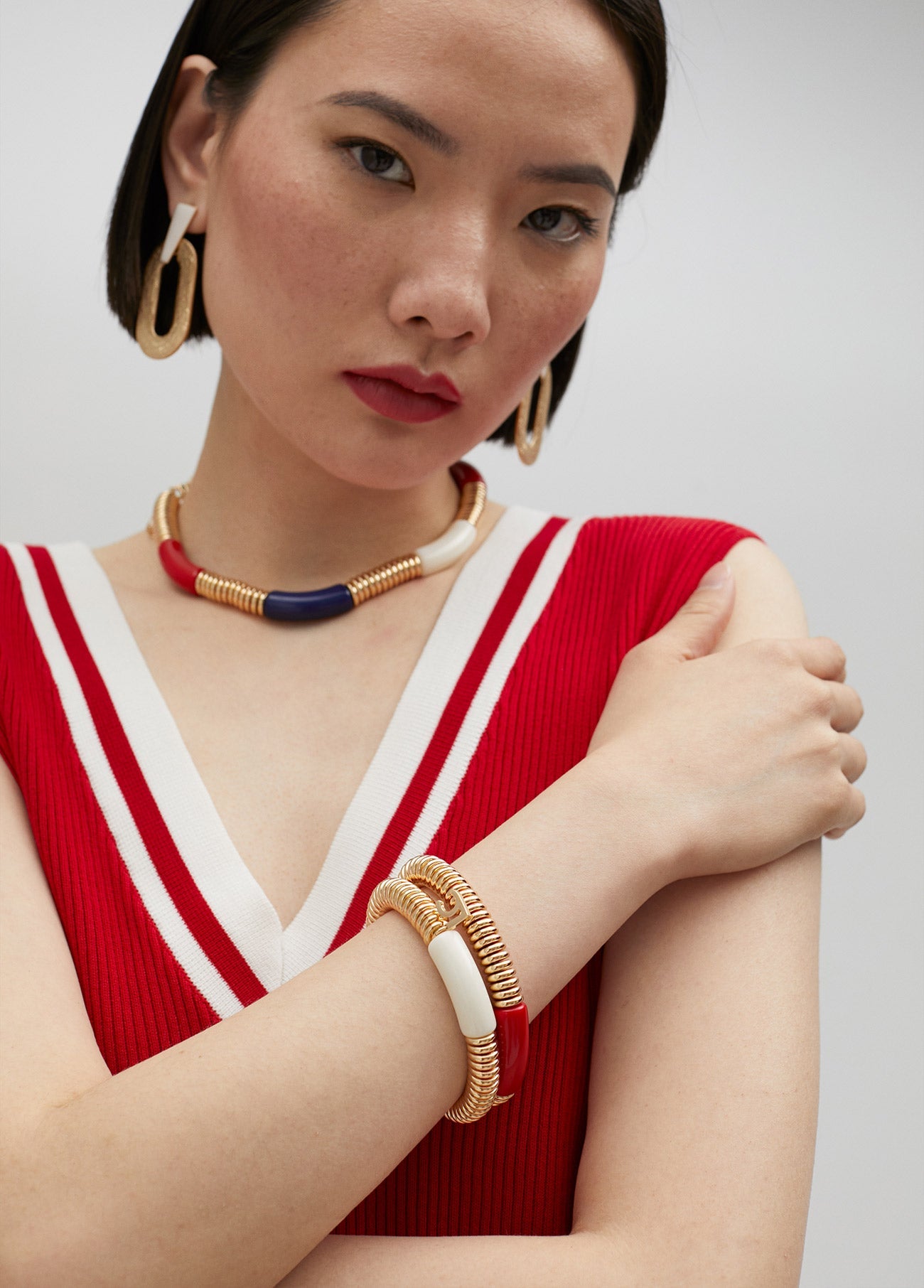 Pack of three elastic metal bracelets with a coloured acrylic piece. Does not contain nickel.