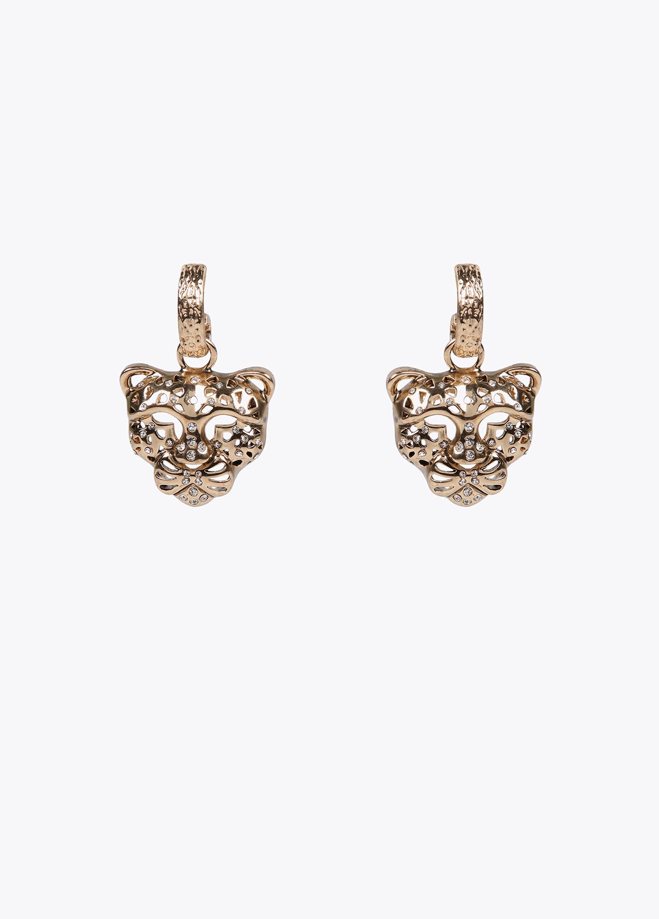 Gold-toned tiger’s head earrings with shiny rhinestone details.
