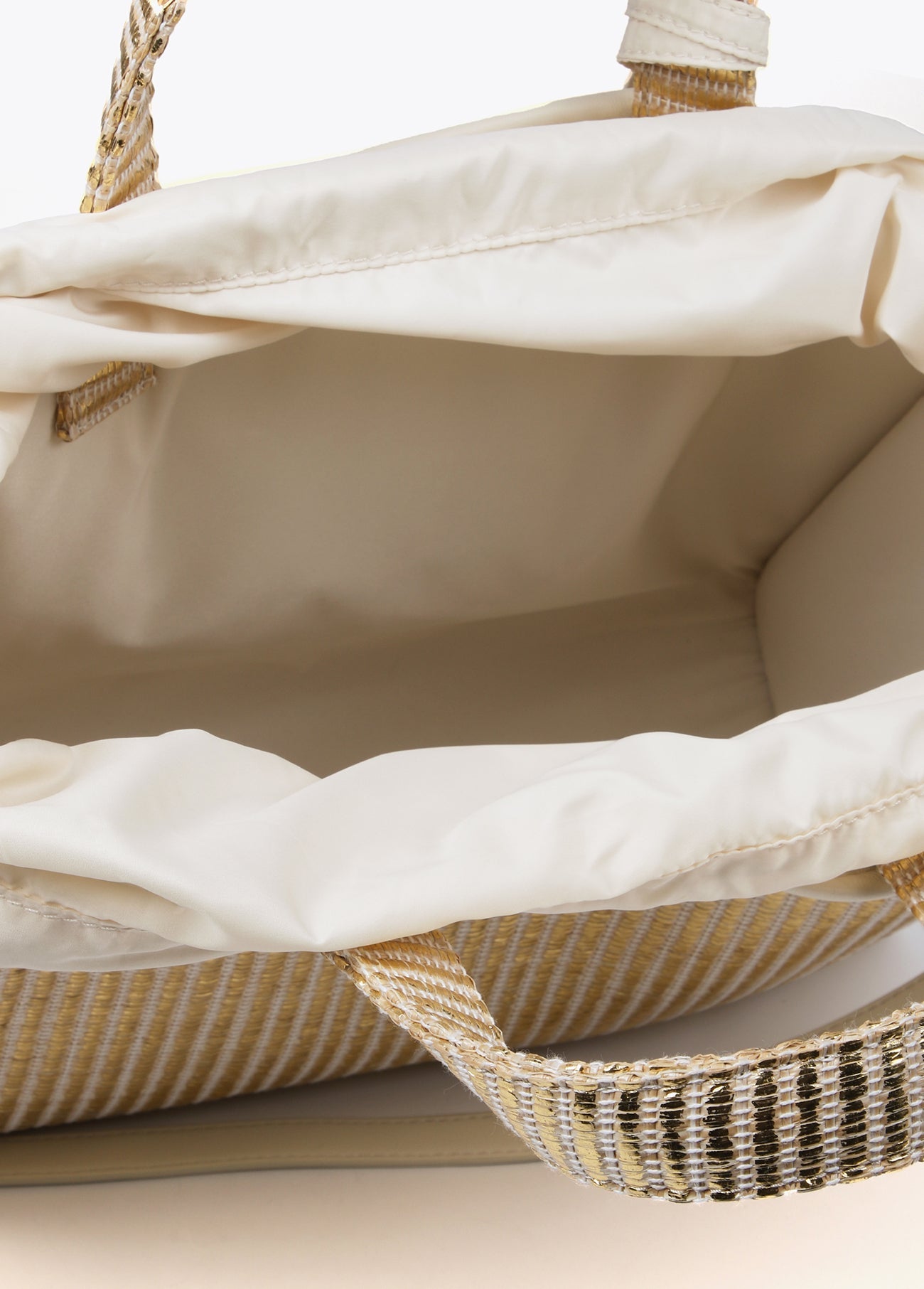 Small tote bag in metallic raffia-effect material. Inside pocket and crossbody strap. Adjustable drawstring closure. HEIGHT: 26 cm - LENGTH: 11 cm - WIDTH: 34 cm / CROSSBODY BAG: 120 cm