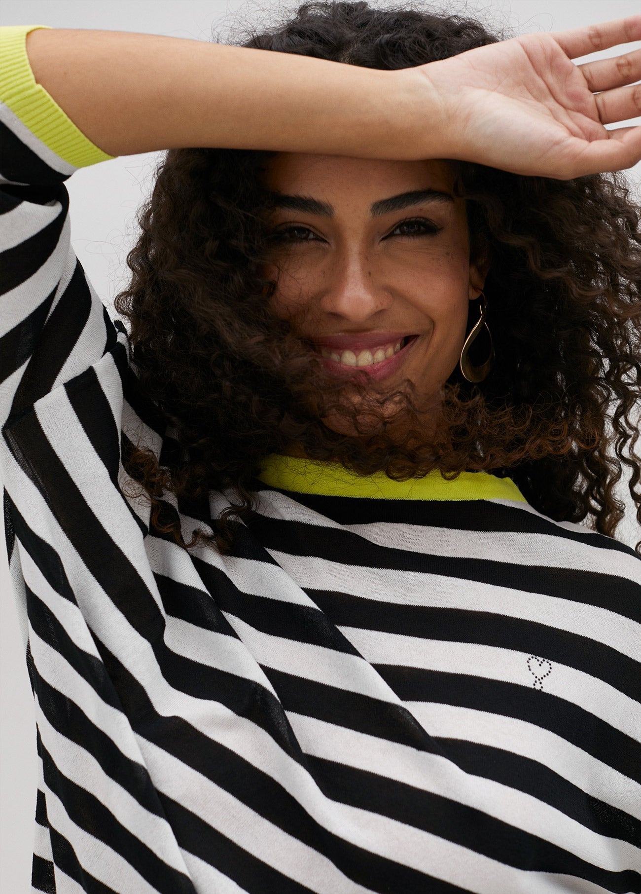 Fine two-tone sweater with black and white stripes and contrasting neon detail.