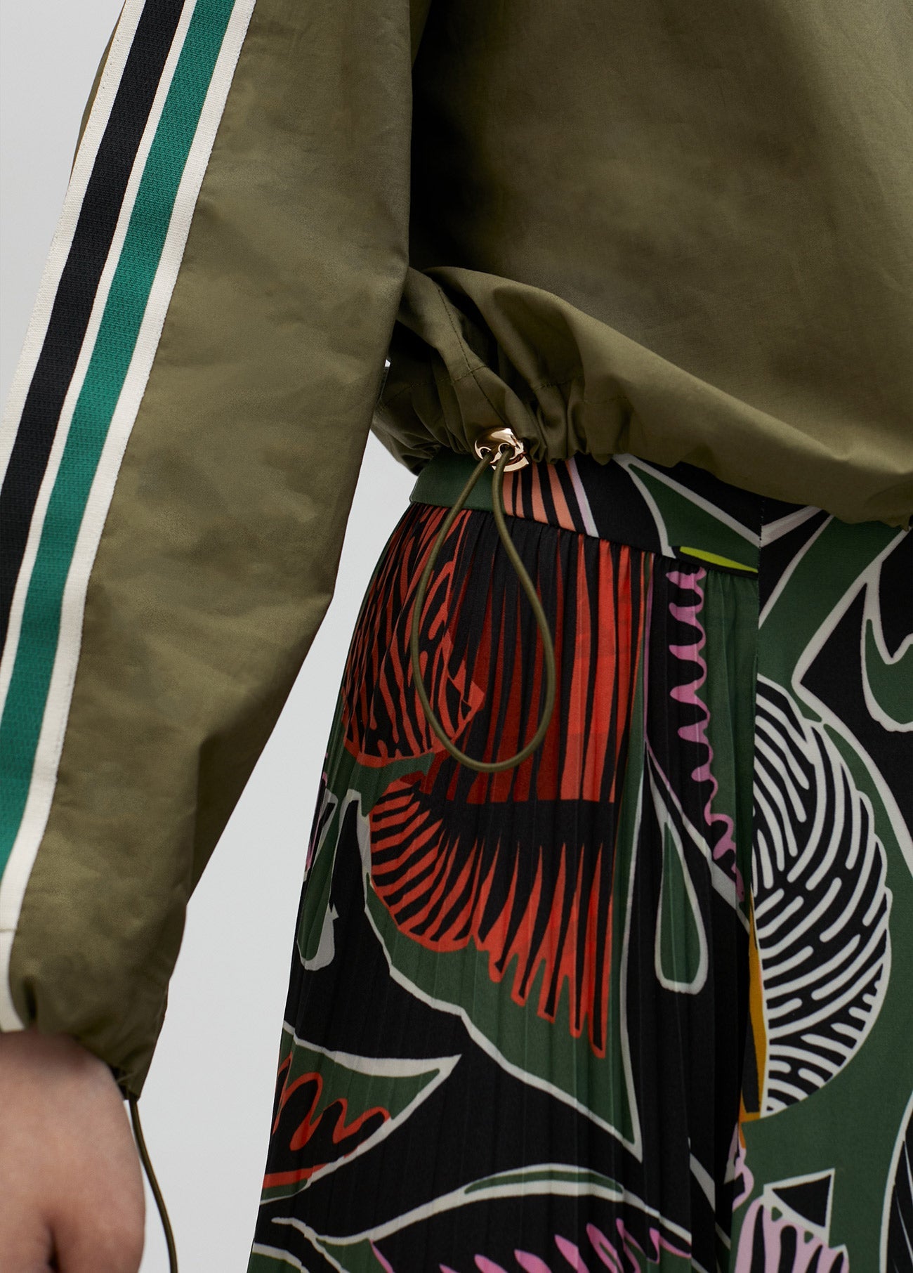 Green shirt with elasticated hem and striped sleeves. Gathered detail on the side and cuffs.