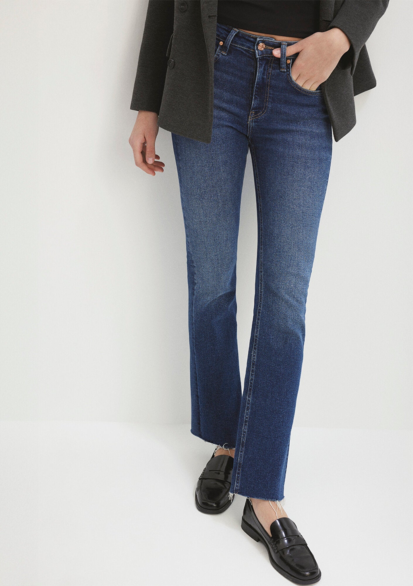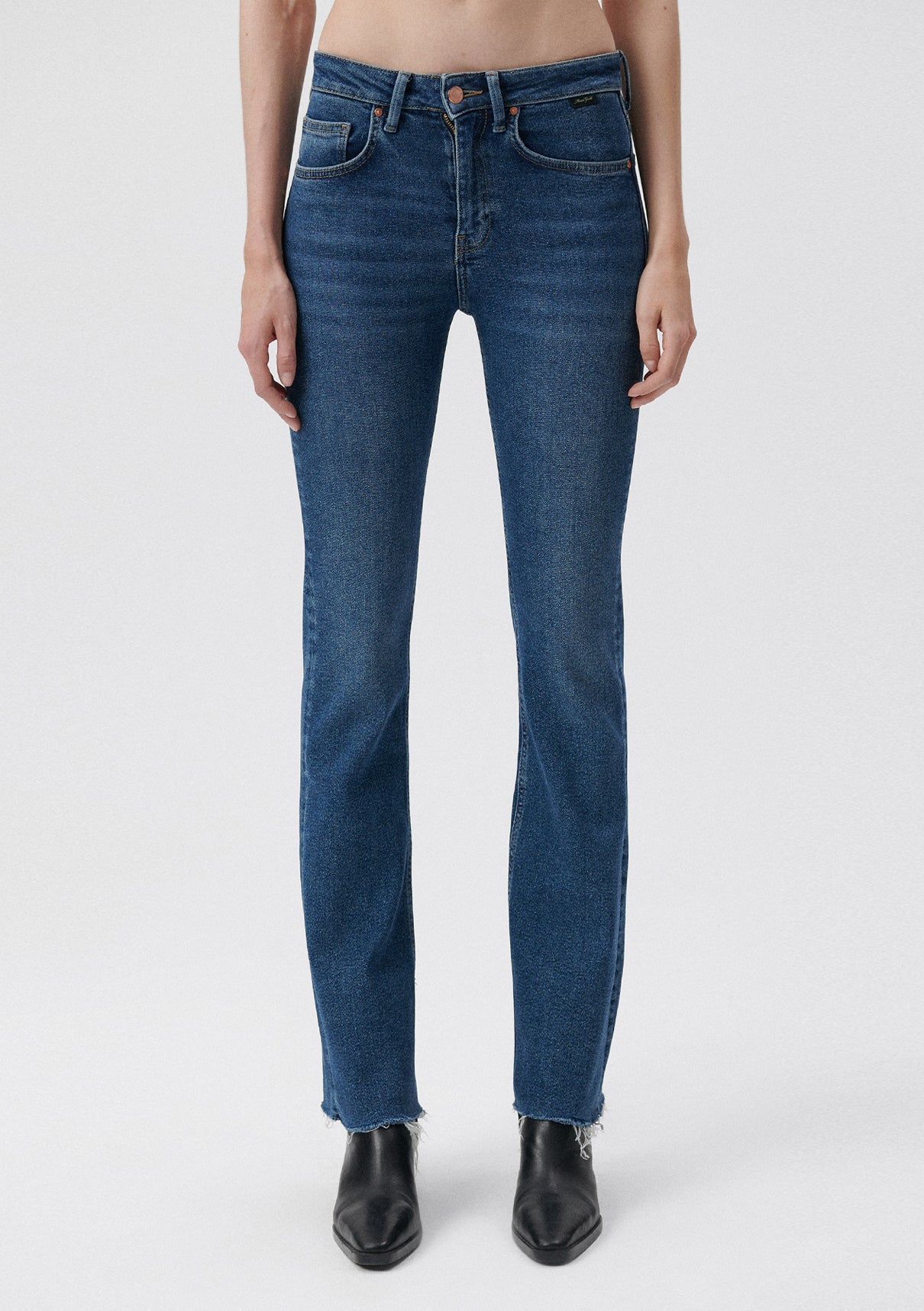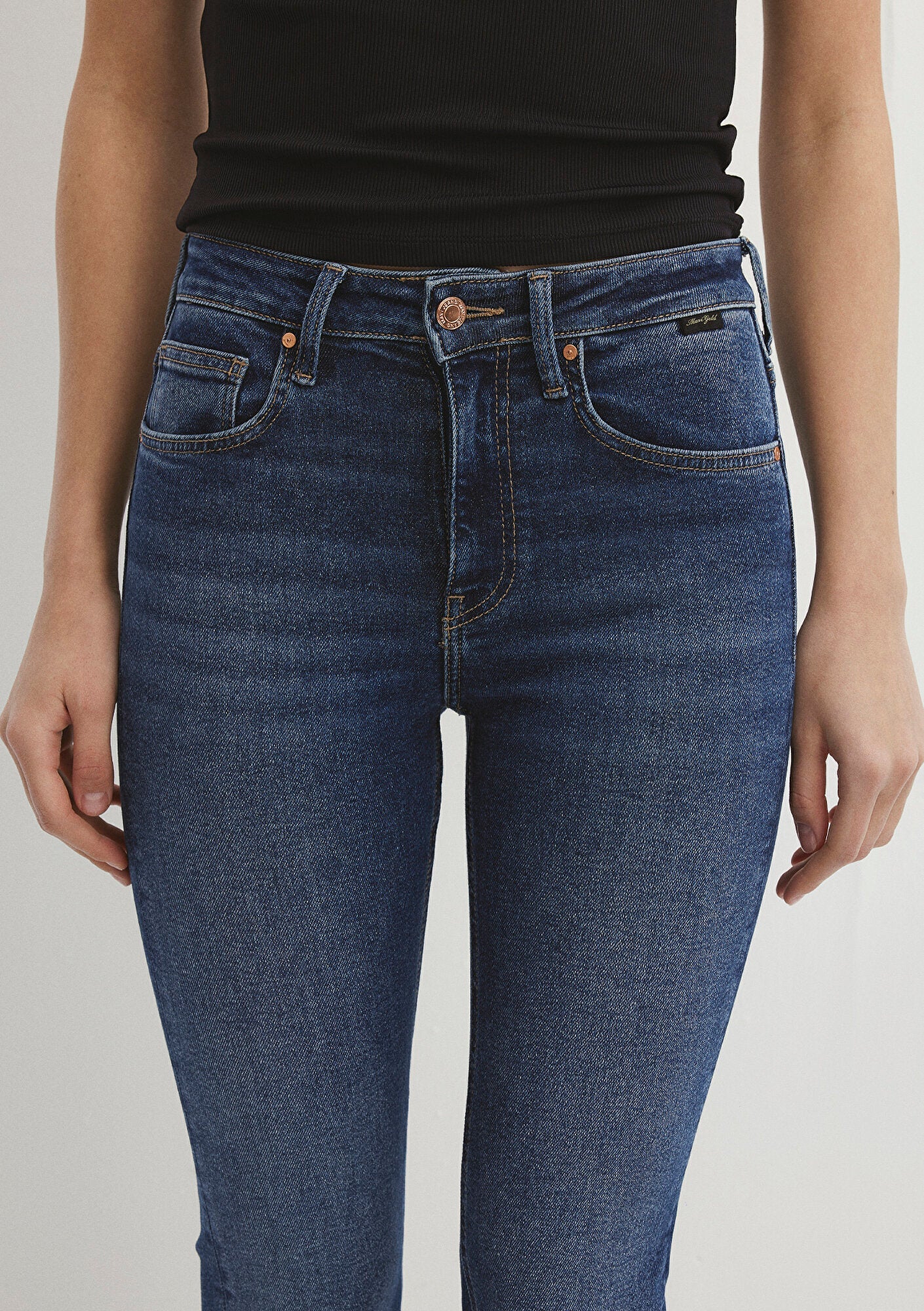 Maria Dark Blue Gold Denim Jean Pants from Mavi denim collection. Sculpting waist and hip. Flare from the knee. High waist. One of the Gold Shape Jeans where 90s denim look meets technology. Super comfortable denim that hugs and shapes the body. With its shiny accessories, it transitions seamlessly from day to night.