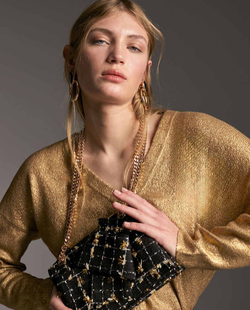 Tweed crossbody bag with a bow on the flap. Golden chain crossbody strap that can be converted into shoulder straps and magnetic button fastening.