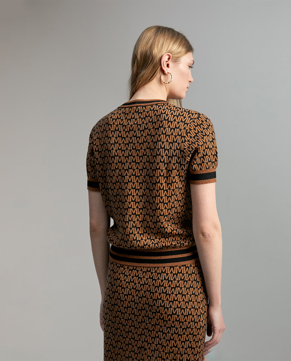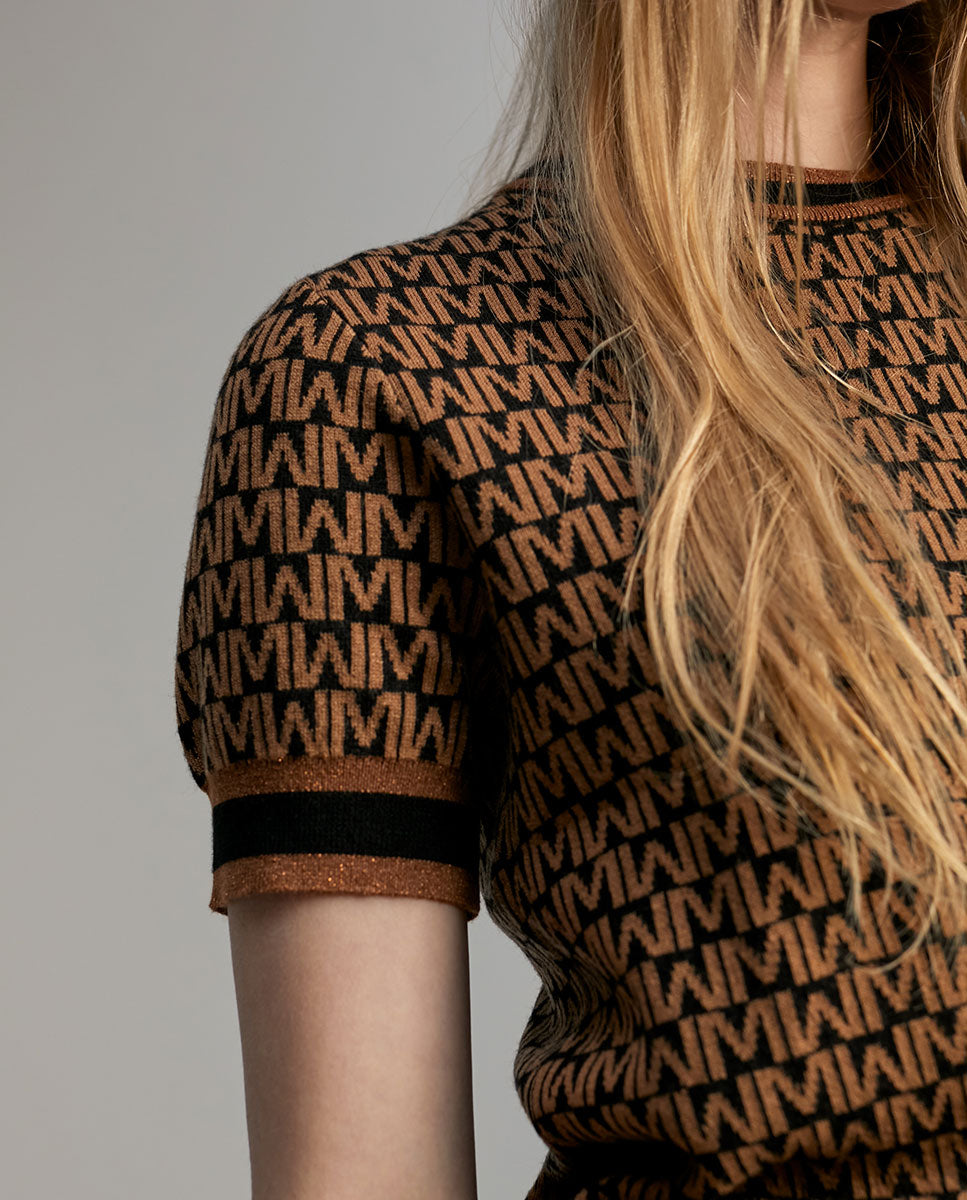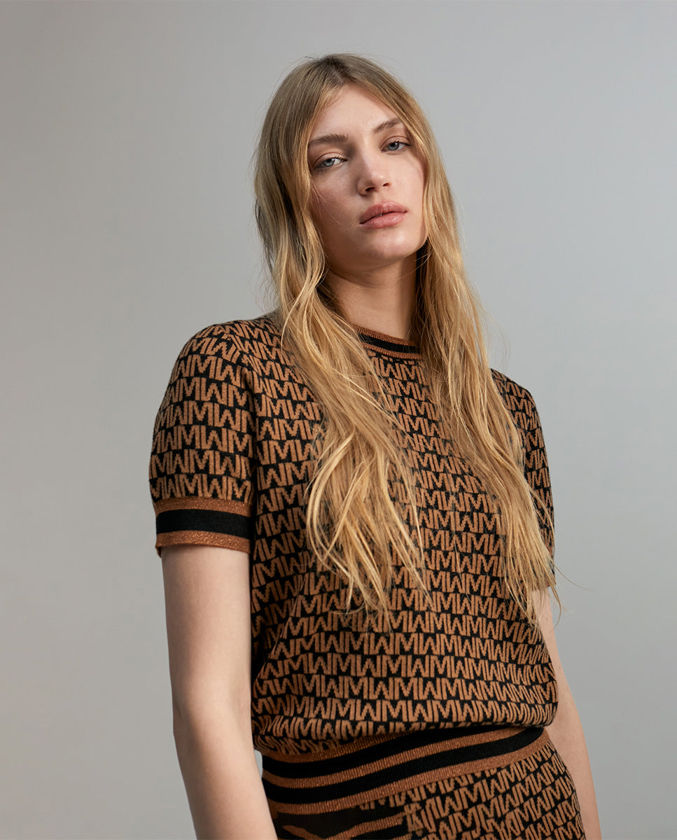 Short sleeve sweater with a round neck. Two-tone monogram print. Contrasting ribbed detail on the neckline, cuffs and hem.