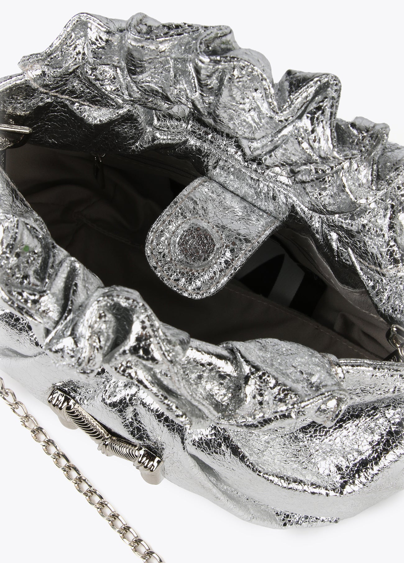 Mini metallic faux leather bag. Gathered handle detail and inside compartment. Includes a metal crossbody strap. Magnetic closure. HEIGHT: 16 cm - LENGTH: 19.5 cm - WIDTH: 9.5 cm / CROSSBODY BAG: 60 cm