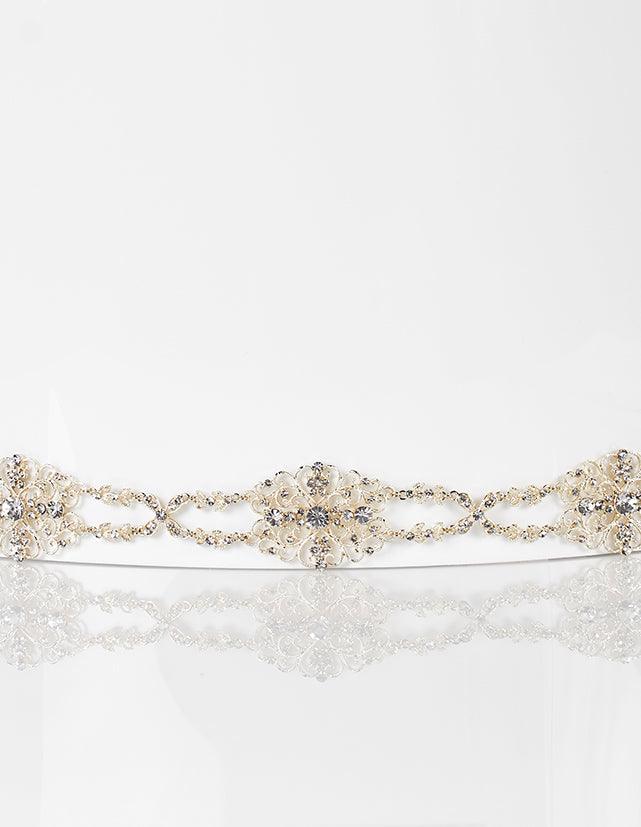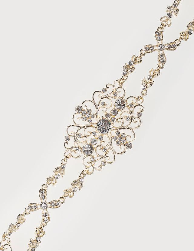 Metal and crystal bridal diadem with organza ribbon, in gold.