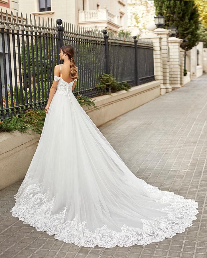 Princess-style wedding dress in tulle and beaded lace. Deep-plunge neckline with short sleeves, low back with shoulder straps, and glitter underskirt.