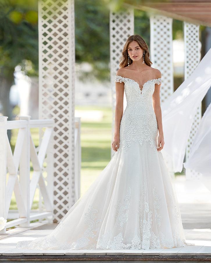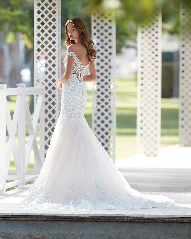 Mermaid-style lace and tulle wedding dress. With off-the-shoulder neckline and low back.