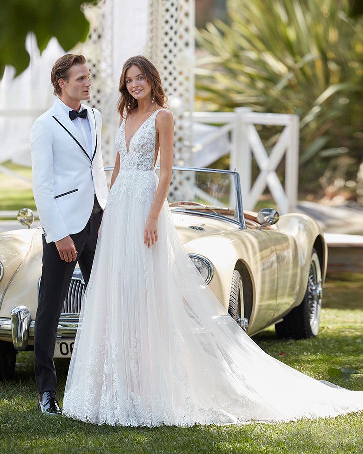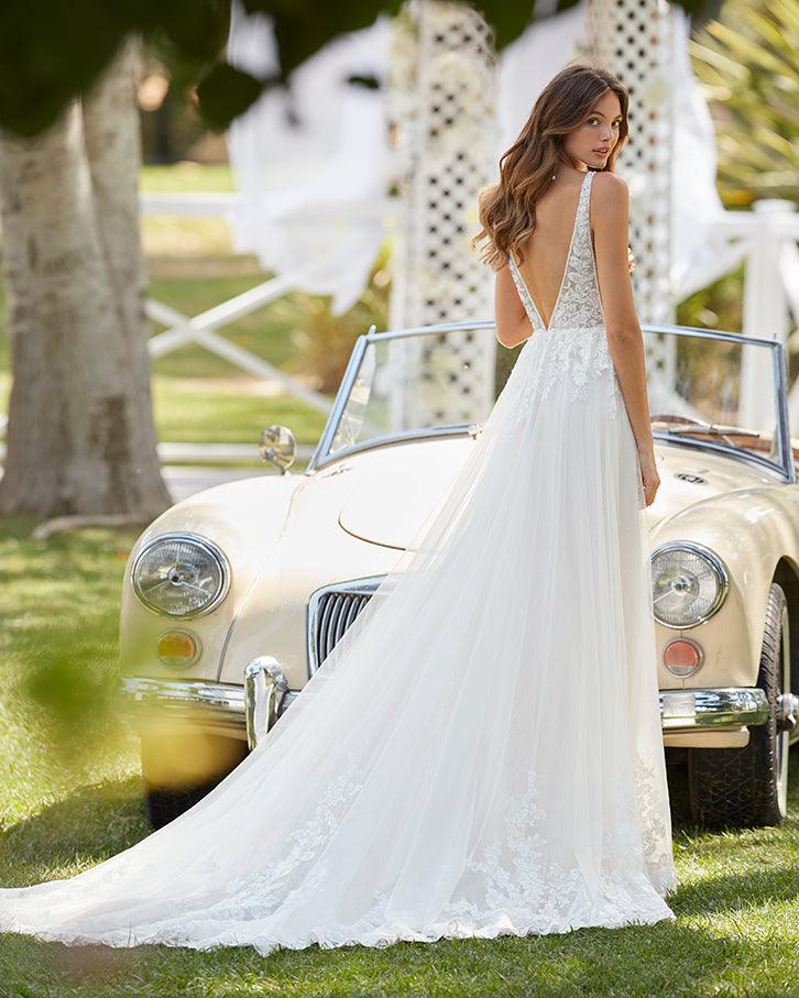 A-line beaded wedding dress in tulle and lace. With V-neckline and back.
