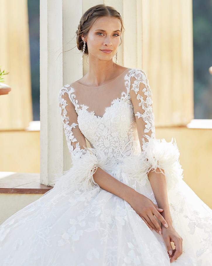 Princess-style beaded lace wedding dress. Sweetheart neckline with illusion overlay, three-quarter sleeves in beaded lace with feather detail, corset back and extra-full skirt.